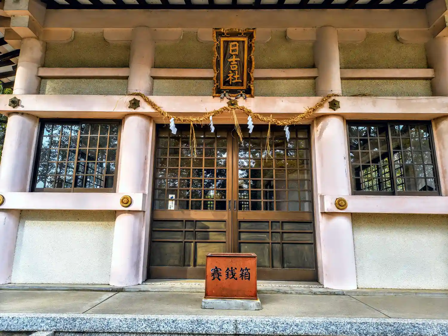 社殿がピンクでとても色合いが綺麗です。