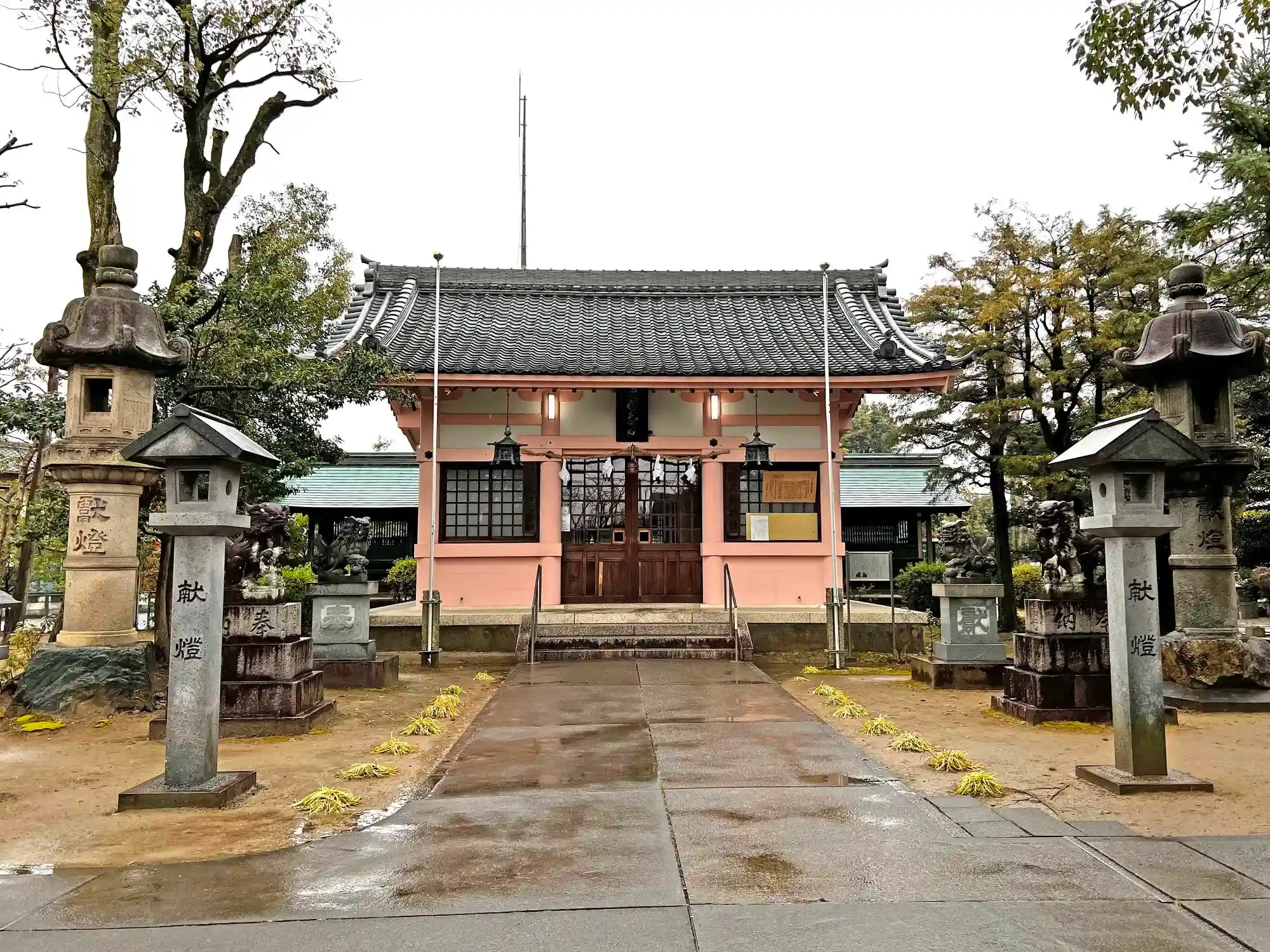 蕃塀が立つ場所から<拝殿>を望む。大きく立派な燈籠が両サイドを固めている。