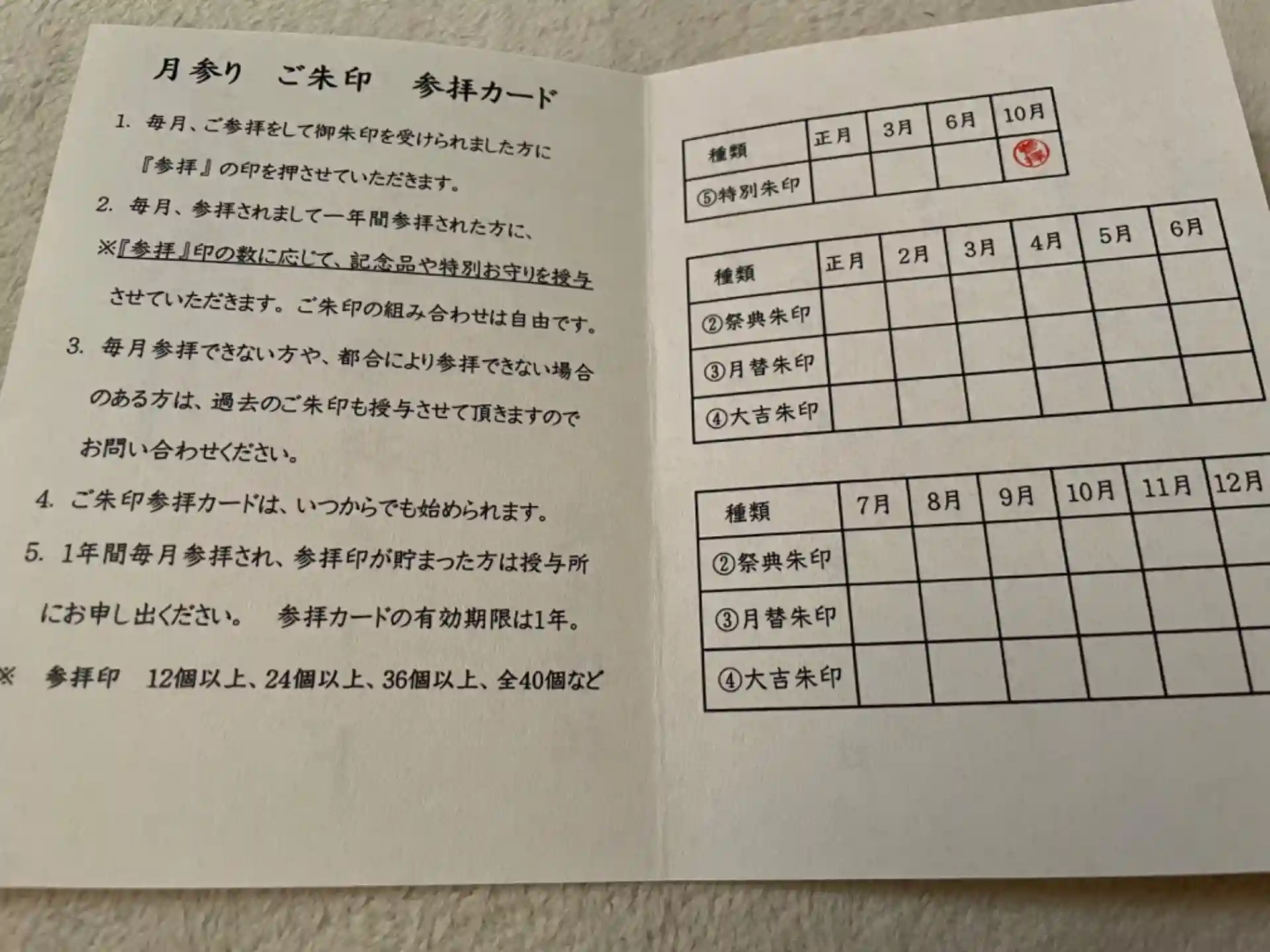 有効期限1年ですが、参拝印の数に応じて記念品や特別お守りを授与されるとのこと。