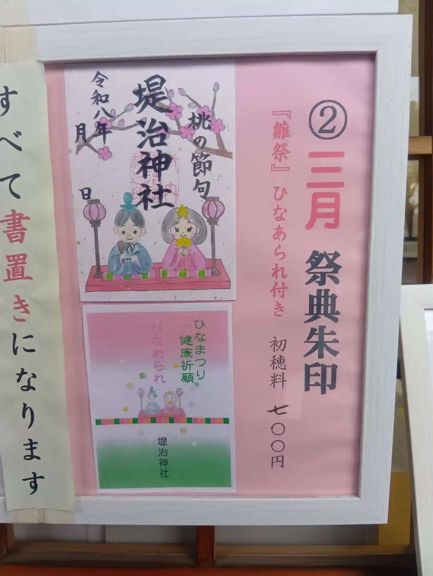 愛知県一宮市、木曽川堤防近くに鎮座する「堤治神社」を参拝させていただきました。御神殿に飾られた100体以上の雛人形が圧巻でした。3月祭典朱印「雛祭り」ひなあられ付き(700円)をいただきました。こちらの御朱印は全て書置きで、月替りのものが多種類あります。スタンプカードがあり、1年間でいただいた御朱印の枚数により、お守りなどのプレゼントがいただけます。境内のハート型の石を探してまわりたかったのですが、あいにくの雨天で、本日は断念。またハート型の石を探しに参拝にうかがいたいと思います。境内の南側に駐車場が3か所あります