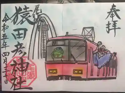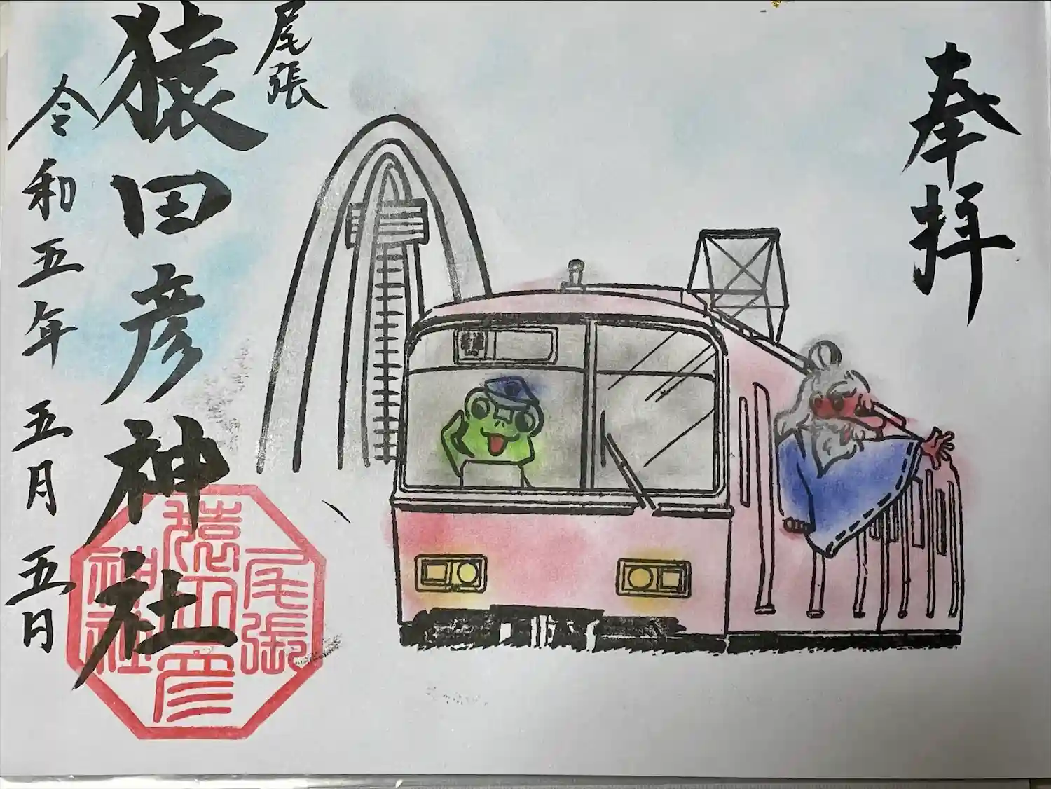 名鉄御朱印めぐりの直書きの特別御朱印です。猿田彦大神と使いのカエルさん🐸が赤い名鉄電車に乗っていて、左後方には、木曽三川公園の138ツインタワーが見えます。