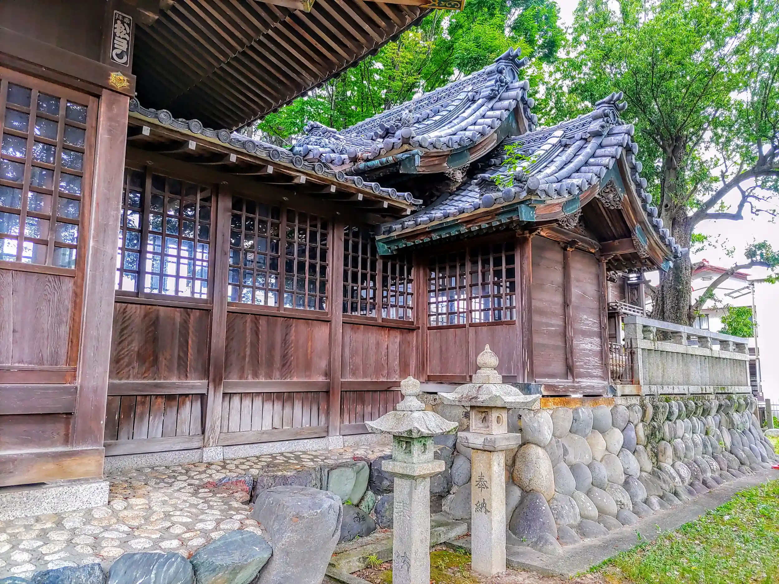 石柱門と鳥居をくぐり抜け、その先に拝殿があります。