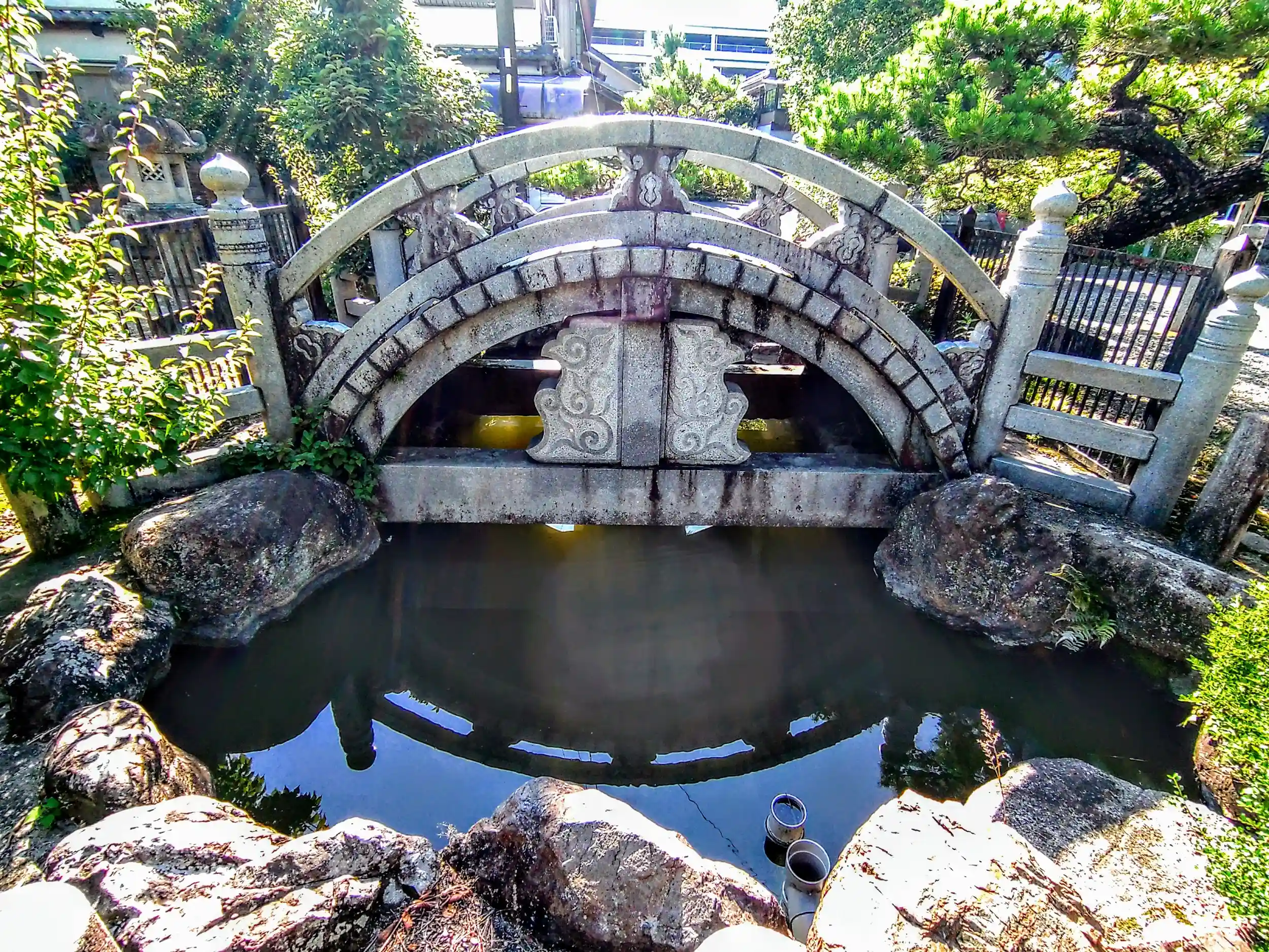御神橋が池に影を落とし、まさしく太鼓橋。