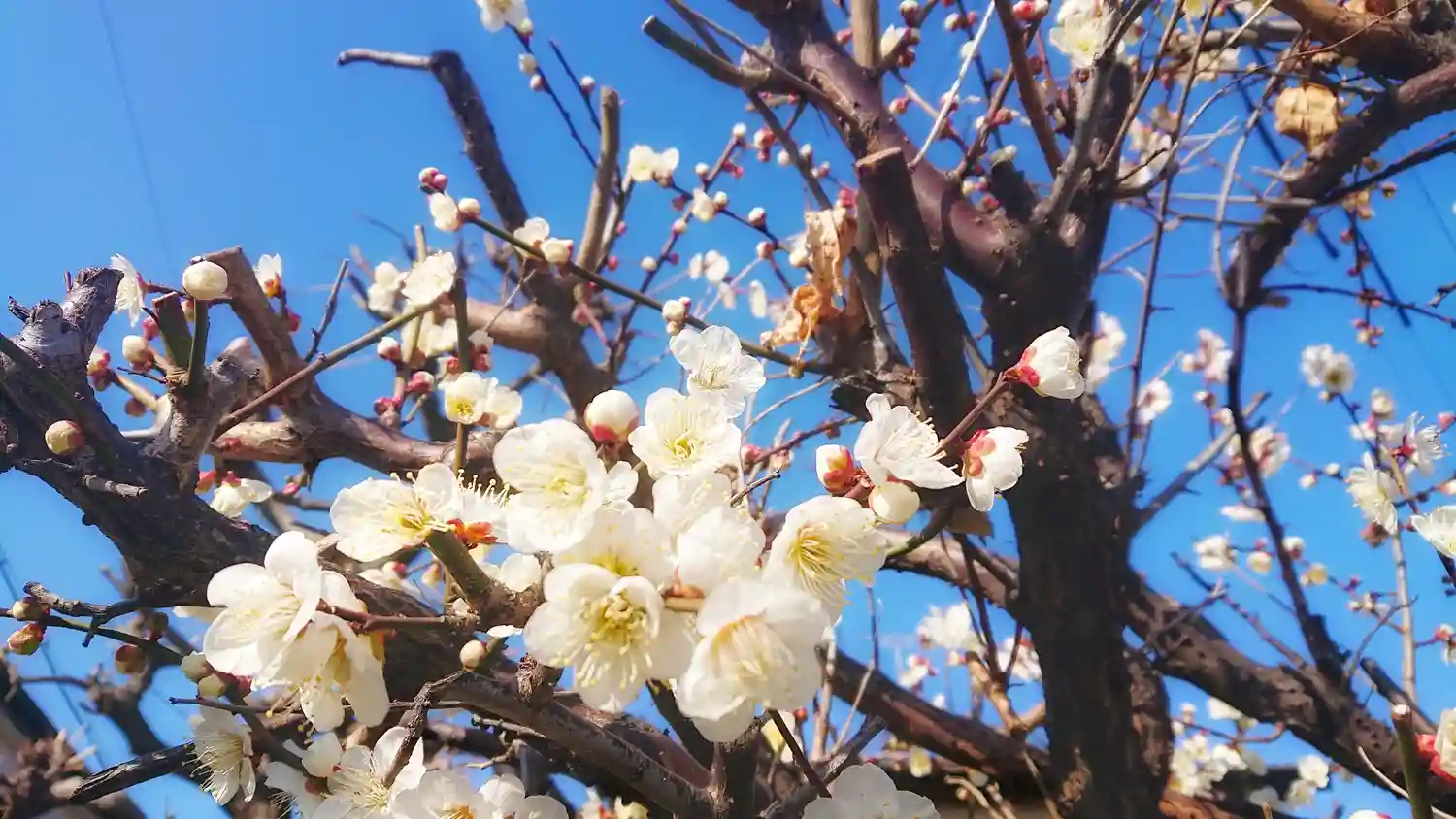 近くに咲く白梅と青空🌸🍃🌱