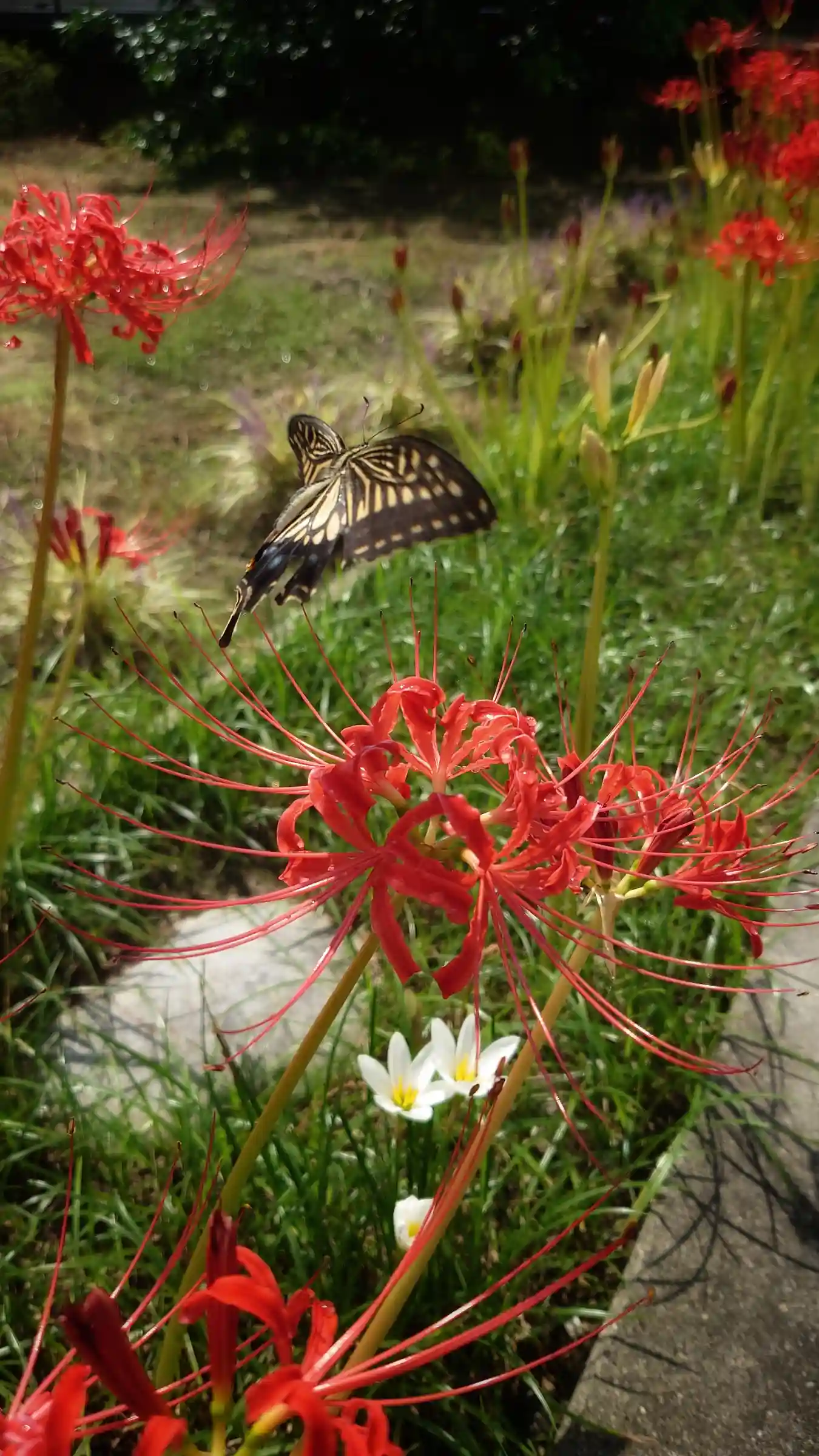 川の土手に咲く彼岸花の蜜を吸う蝶々🦋𓂃 𓈒𓏸𑁍