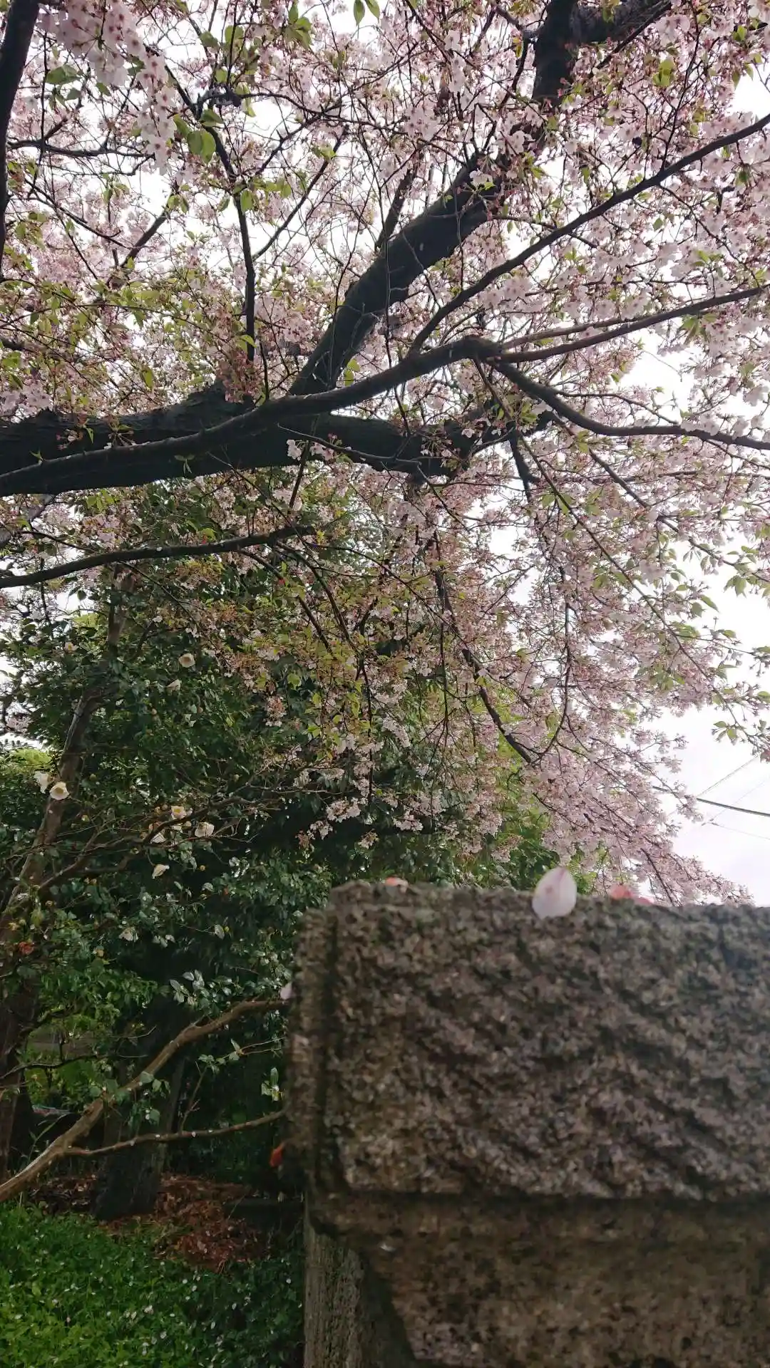 近くにお地蔵さんを見かけて、見上げると桜雨🌸☔