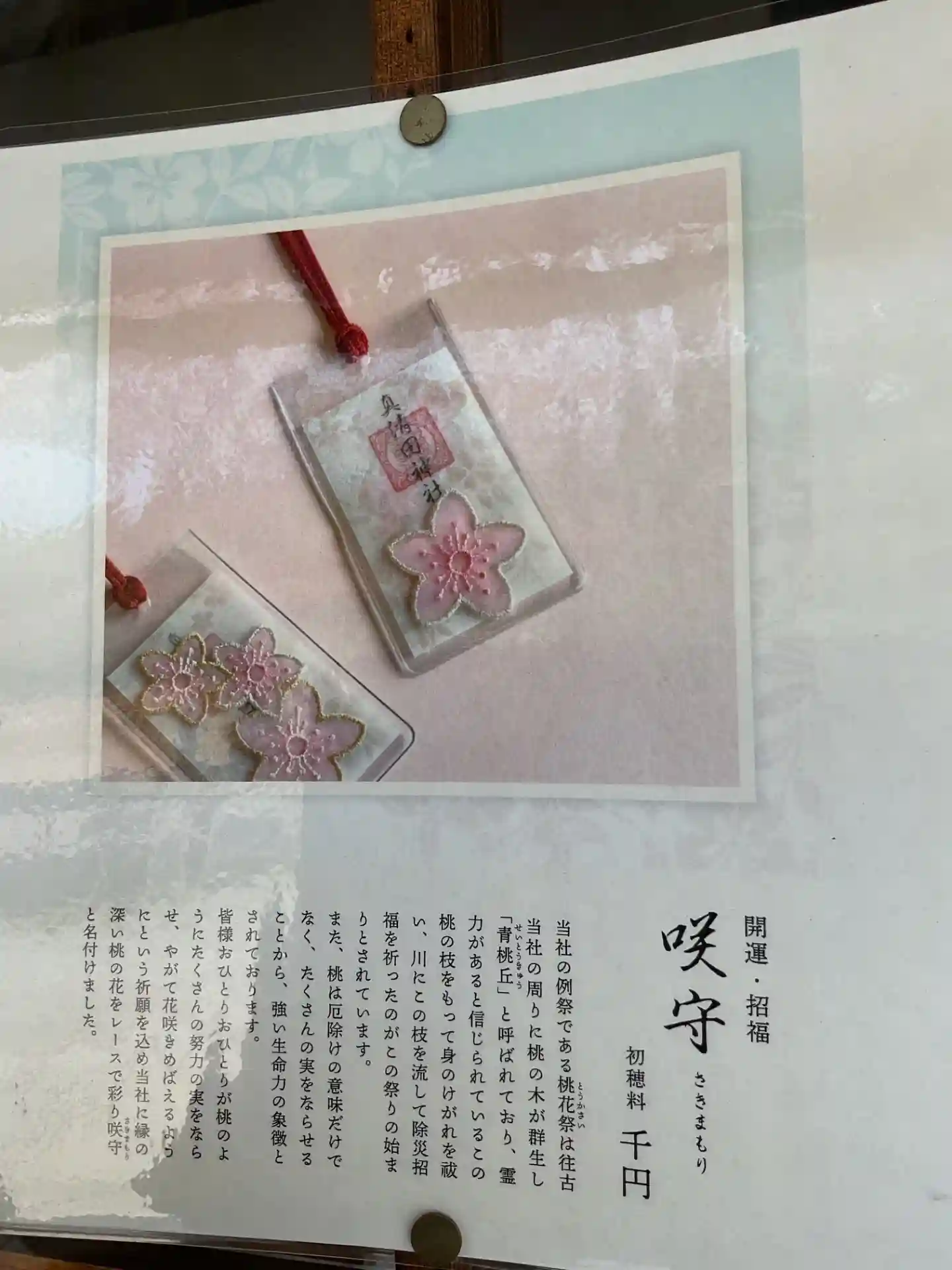咲守、桃花祭に因んでの御守、おひとつ千円の納め