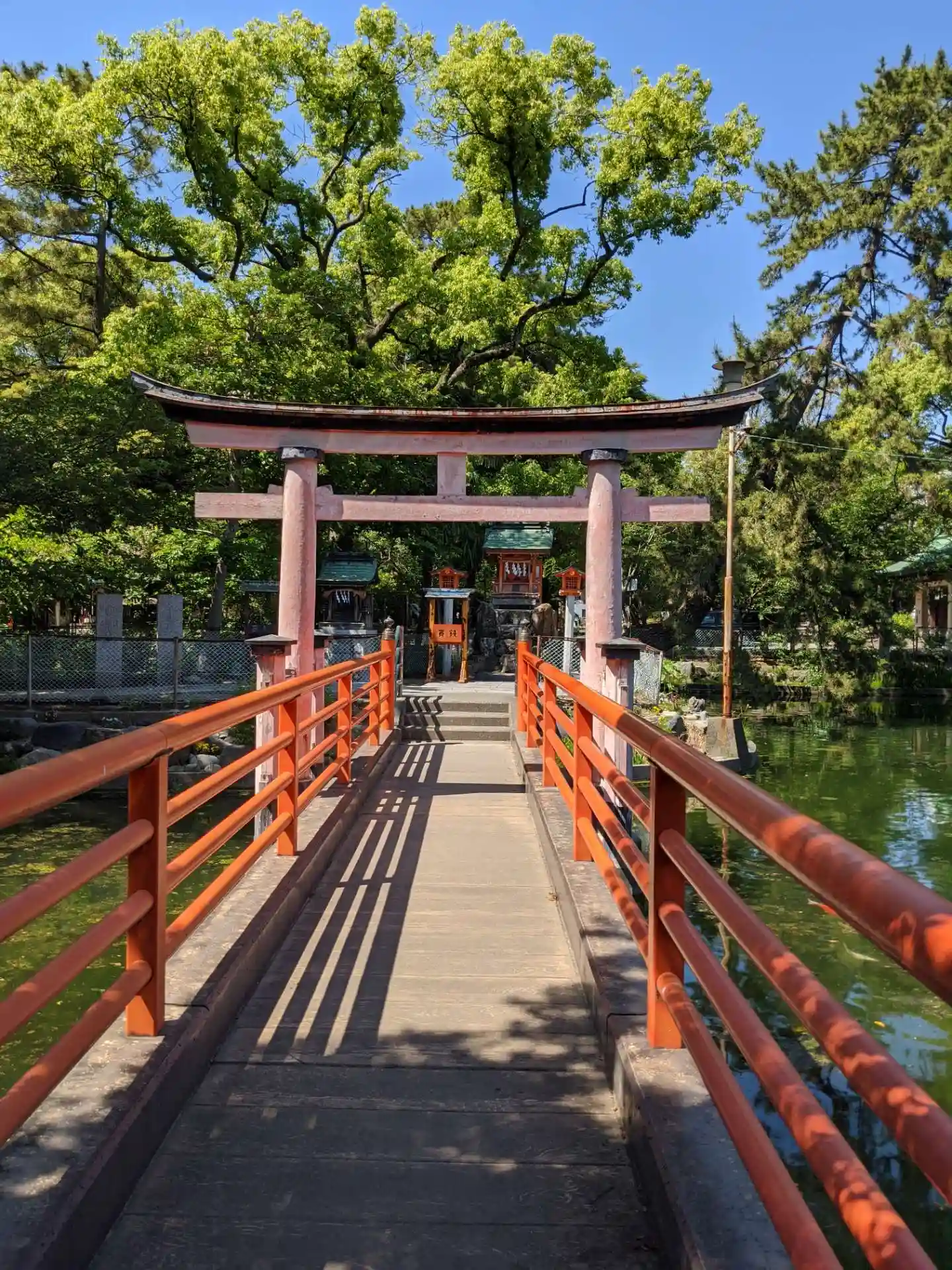 橋の先にある厳島社。赤で統一しています。