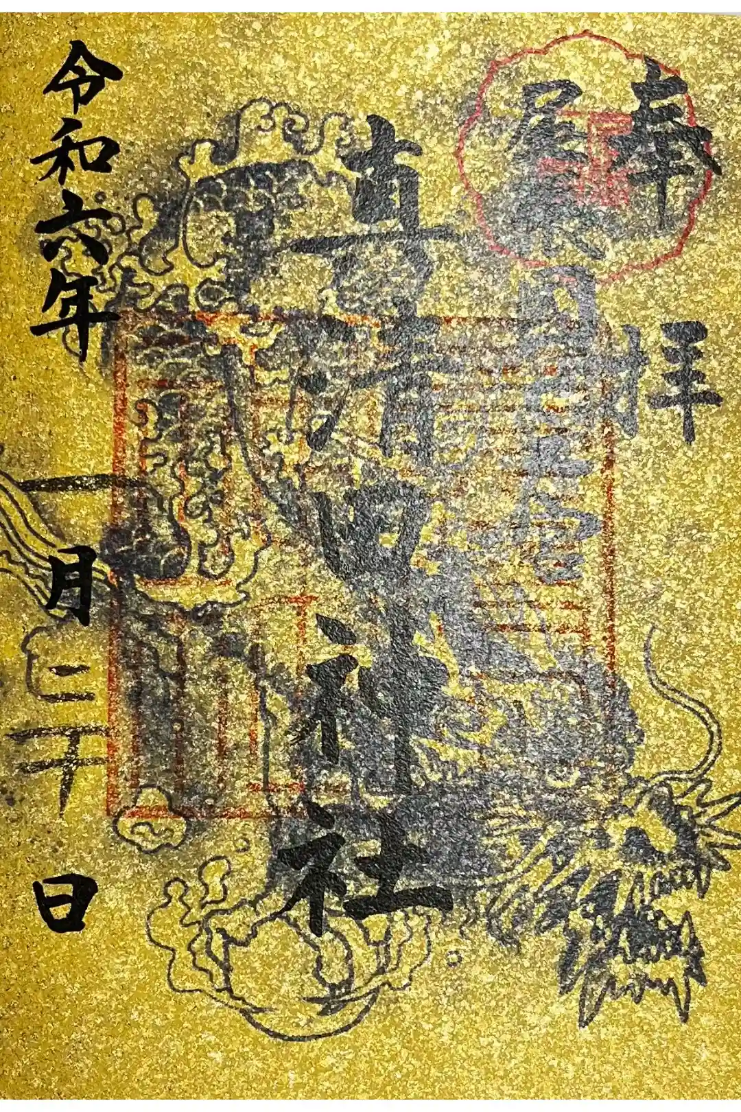 令和6年度・お正月限定の書置き御朱印、金神に登り龍が描かれて縁起の良い作品となっています。