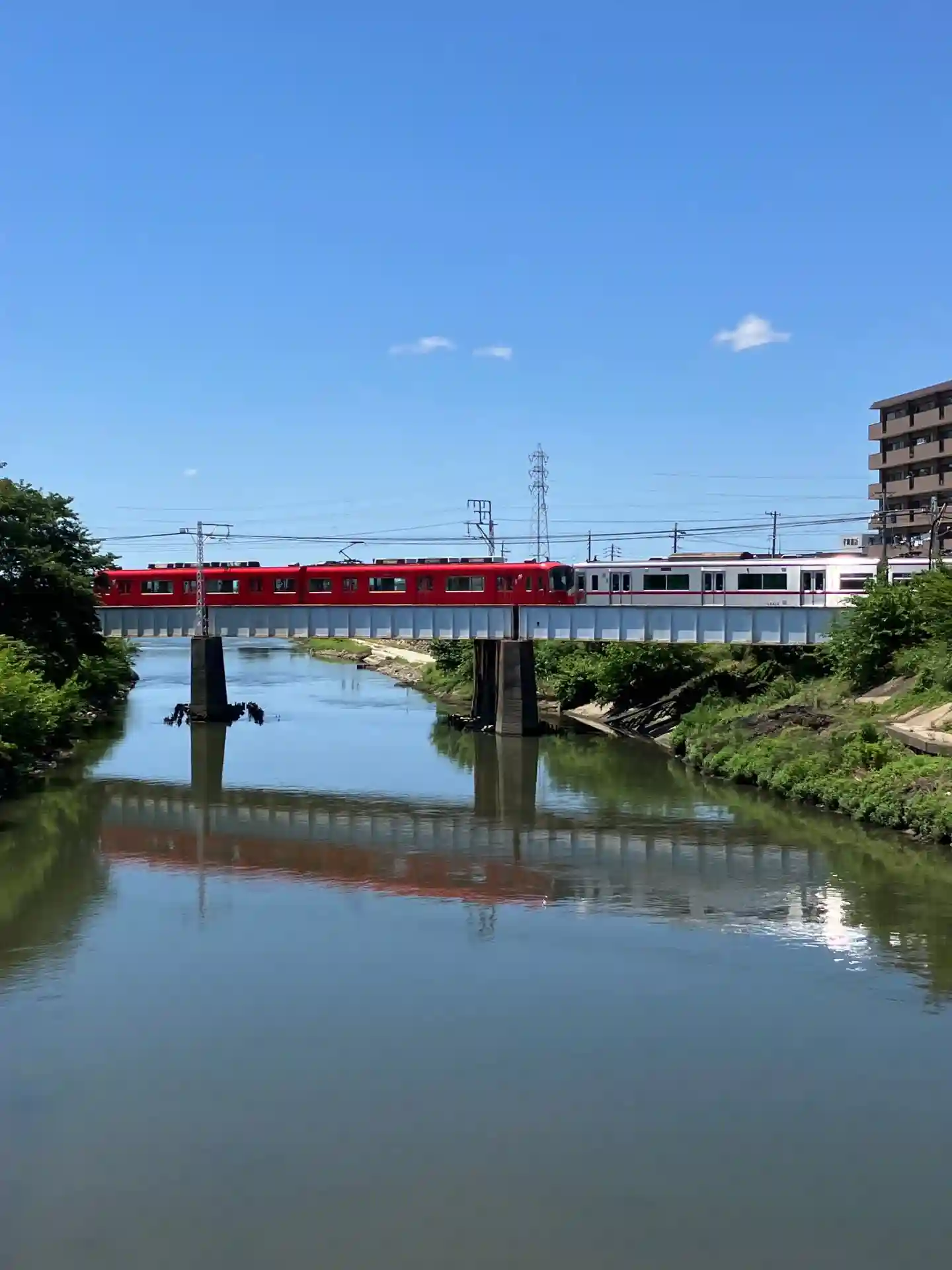 新清洲駅東口からすぐ、五条川を渡る名鉄電車。水に映ってとても綺麗でした。