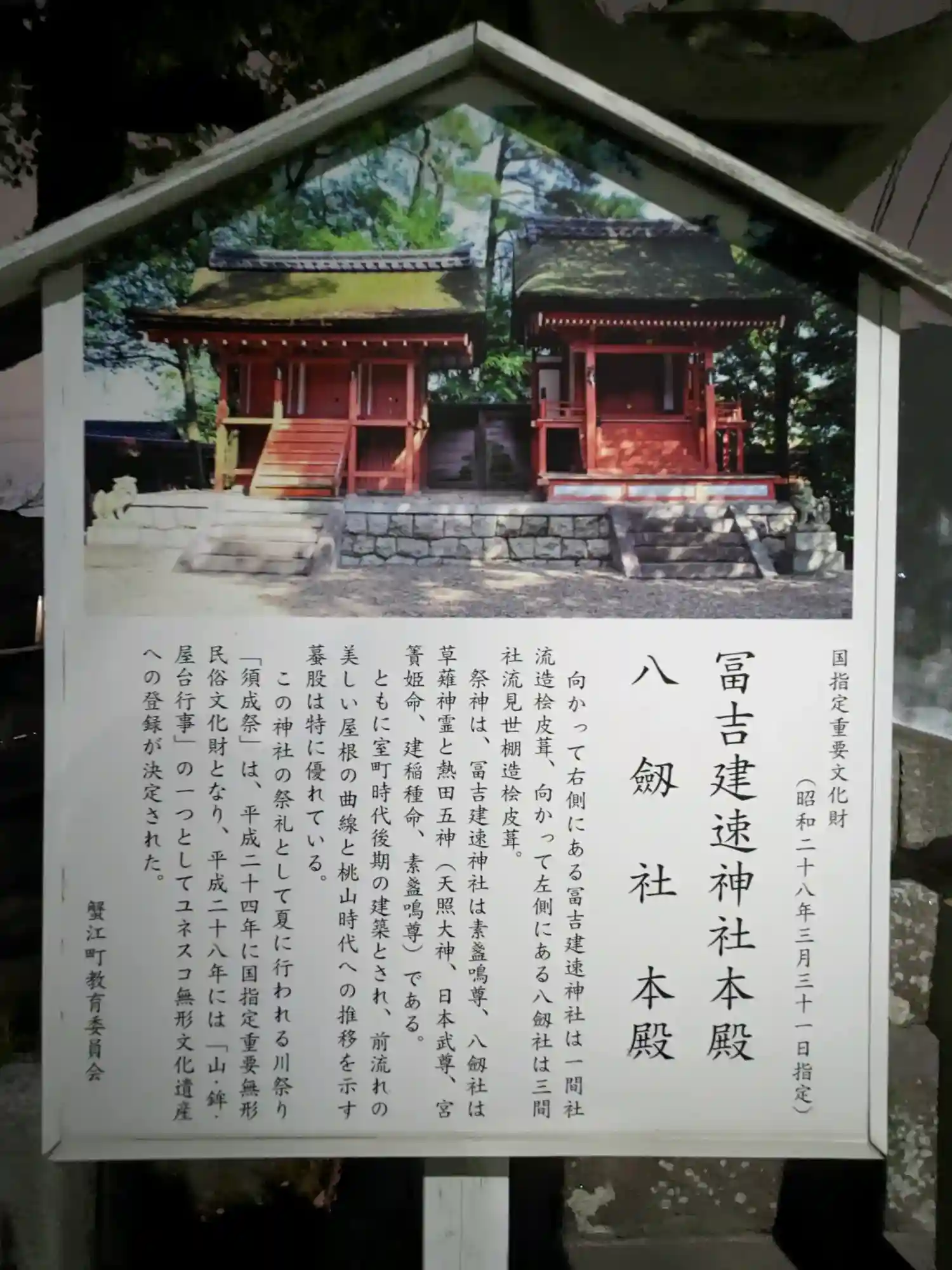 また、豊臣秀吉が米銭を献じて疫病退散を祈願したと伝えられています。冨吉建速神社本殿は一間社流造桧皮葺、八剱社本殿は三間社流見世棚造桧皮葺で、それぞれ室町時代の特色を持った建物。