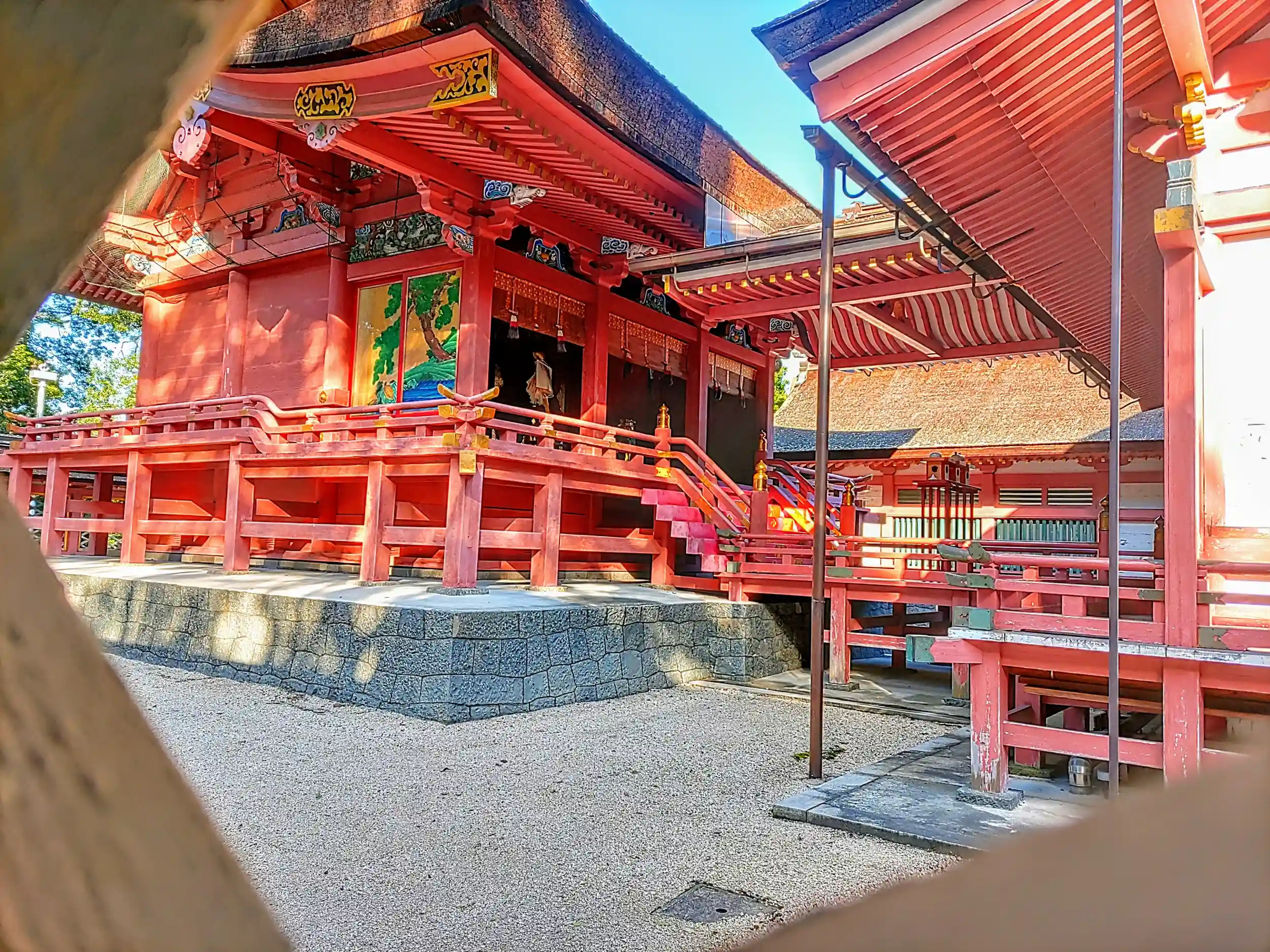 拝殿 青い空に赤い社が映える。