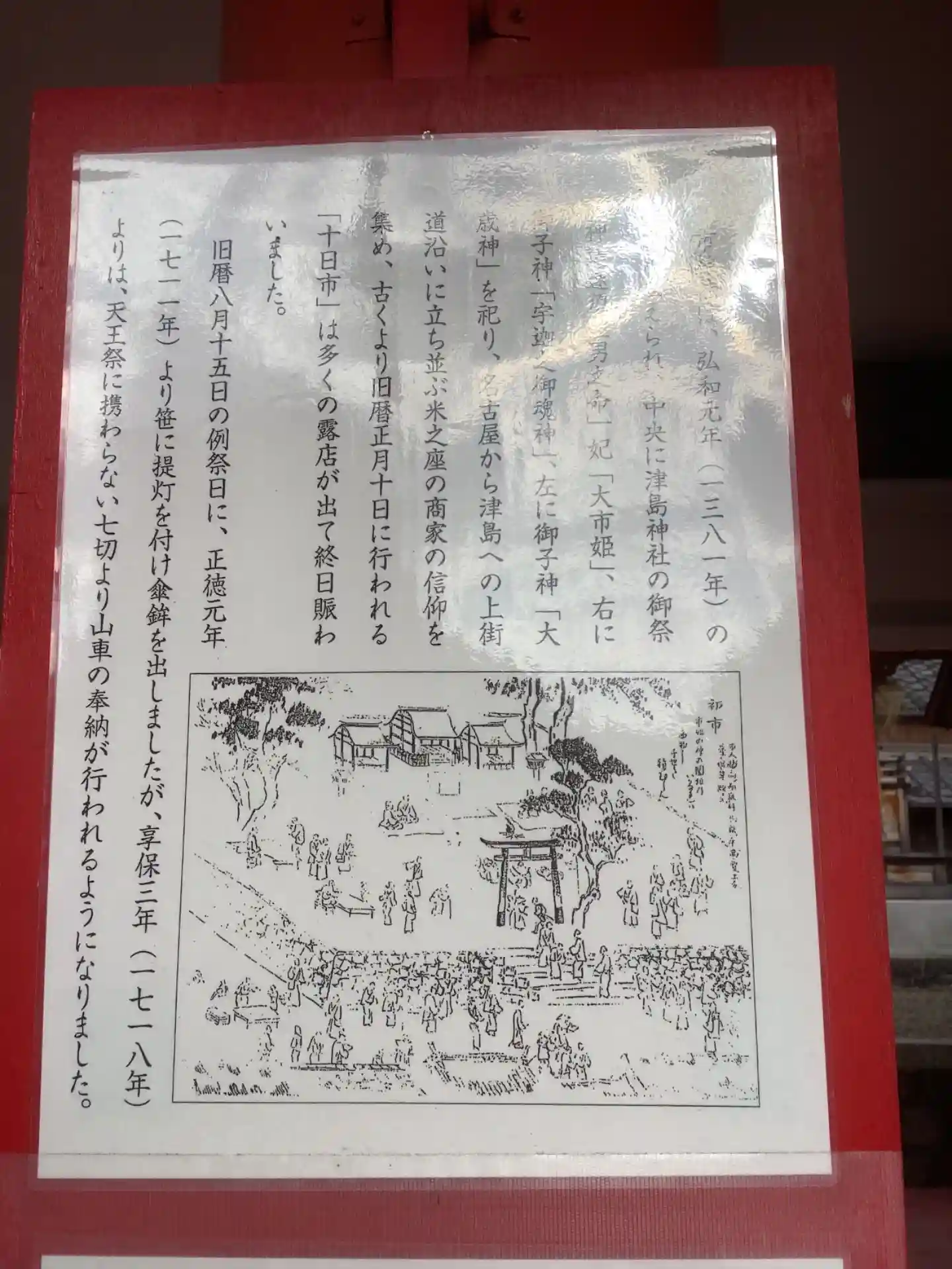 | ご由緒 | 津島神社の境外末社の一つで、弘和元年(1381)に創建されたといわれている。社殿は天保8 年(1837)に修造、明治32 年(1899)と昭和27 年(1952)に改修されたが、損傷が激しくなったため令和元年(2019)に新たな社殿が竣工した。ほかに年代が明確なものとして、境内には延享2年(1745)及び文政7年(1825)の銘がある石灯籠がある。