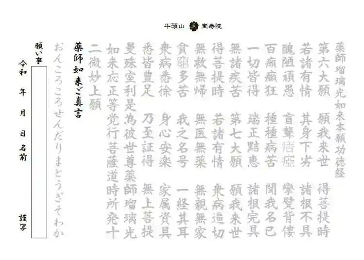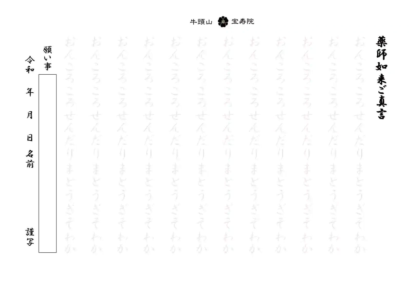 「薬師十二誓願」に則り、ご真言を12回お写経下さい。書き終わりましたら胸の前で合掌し、祈りを込めて声に出してご真言をお唱えしてみて下さい。