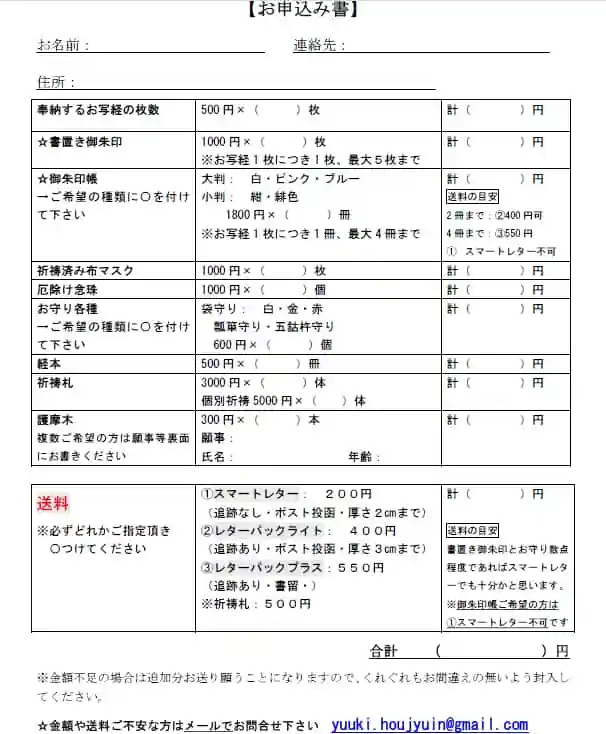 ・御朱印帳・お守り・ご祈祷札をご希望の方は一緒にお送りできます。代金と、希望数書いた紙を同封下さい。(「お申込書」PDFダウンロードしてお使いください)