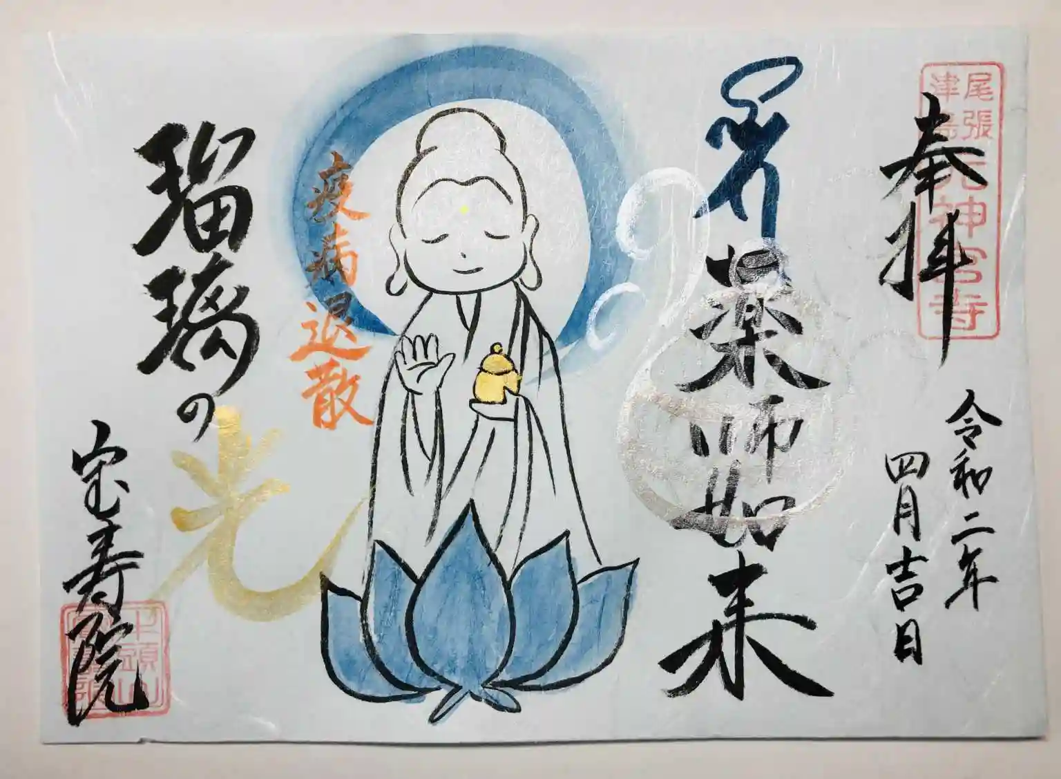 薬師経は大変長いお経です。薬師経の根幹とされる「第六・第七の大願」を抜き出しております。瑠璃光如来ですので、ブルーのペンで書いてみるのもオススメです。