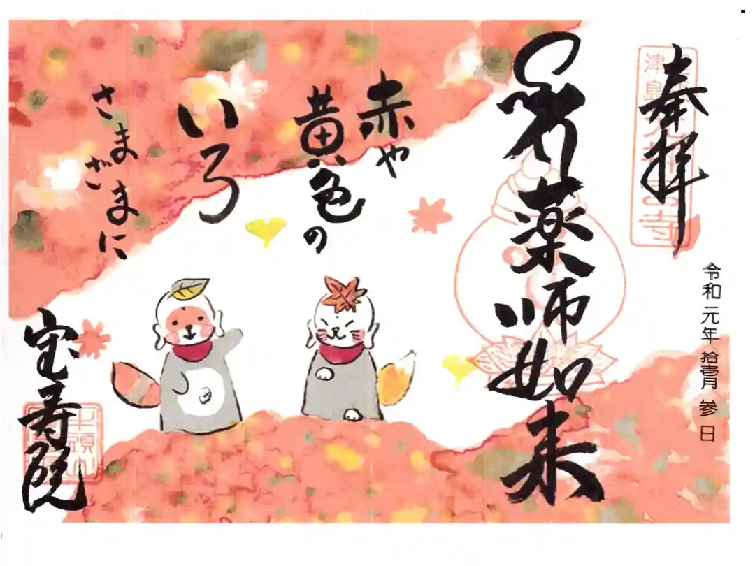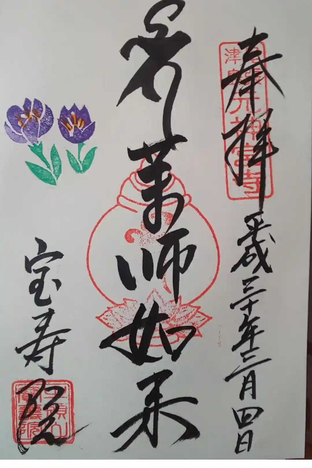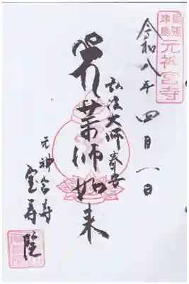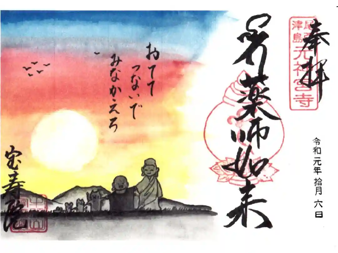 真ん中に薬師如来の梵字と文字、左下に宝寿院と書かれ、上に尾張津島元神宮寺の印、真ん中に梵字の印、左下に牛頭山宝寿院の社印が押されています。