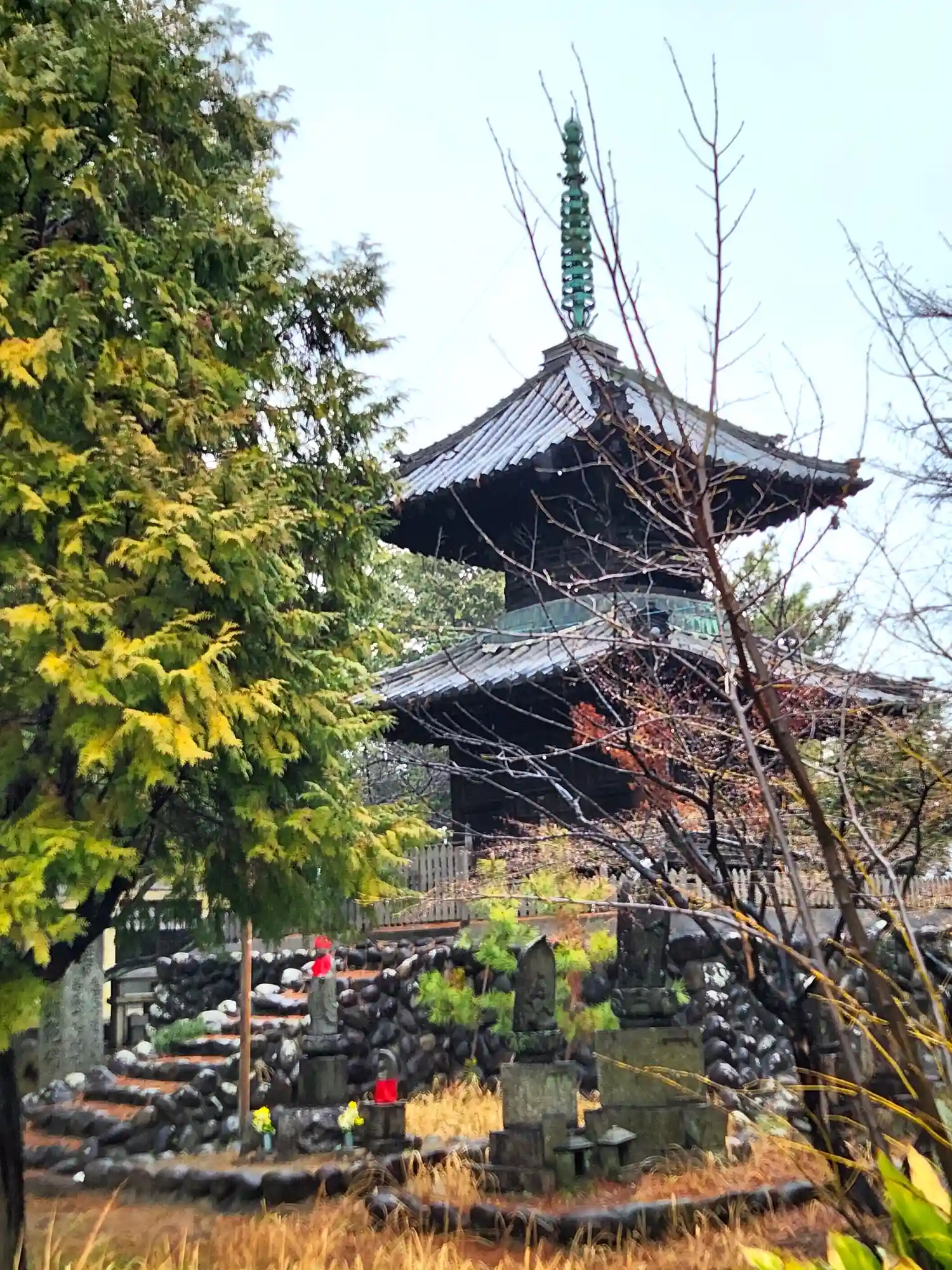 天保5年に尾張藩主から寄進された多宝塔は江戸時代から唯一残る貴重な建物で、瓦に三つ葉葵の紋があり、愛染明王が安置されています。 建立時には地下から永享9年(1437)銘の宝篋印塔の残片が出たといいます。