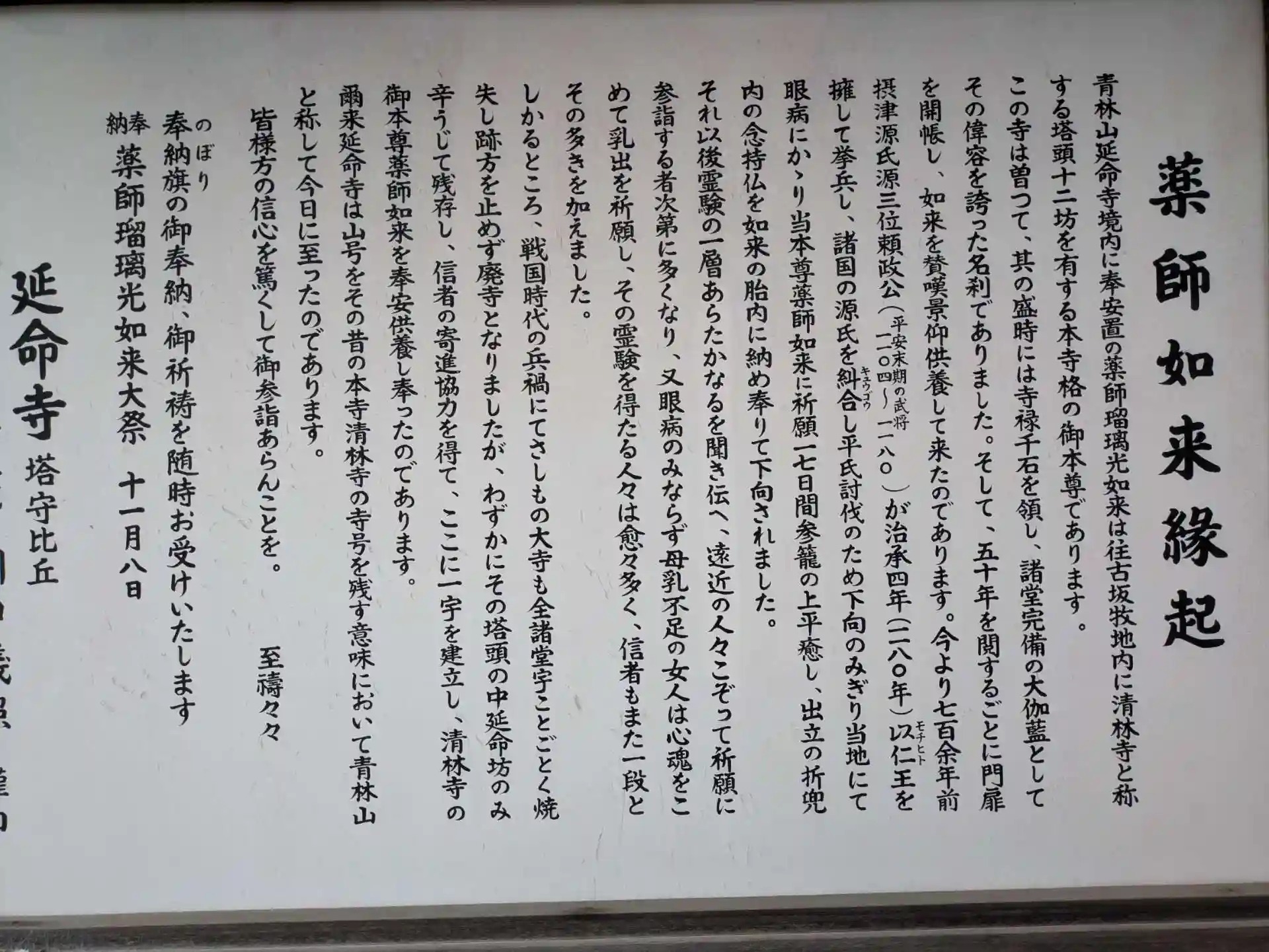 1156年に源頼政公が平氏討伐のため 関東に下向する折 当地で 目の病に罹り 本尊薬師如来に祈願したところ回復し 頼政公は 念持仏を如来の胎内に納められ 鎌倉7代目将軍源惟康より 現在のご本尊である延命地蔵尊が寄贈され 清林寺から延命寺と変わりました