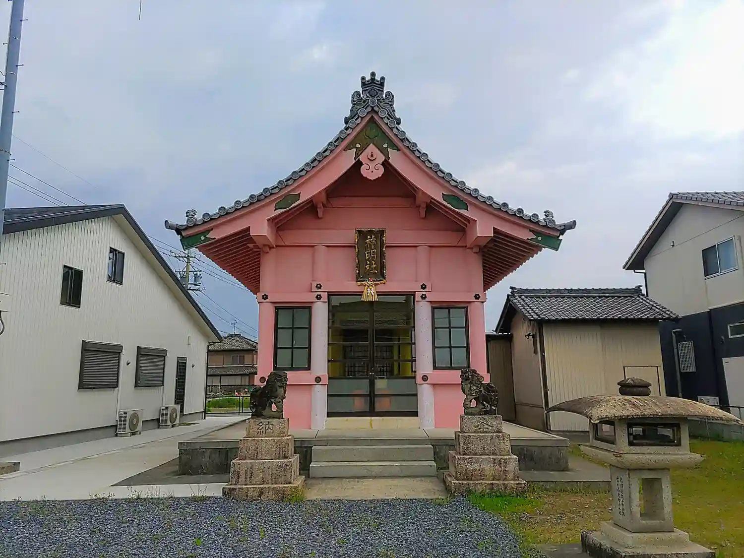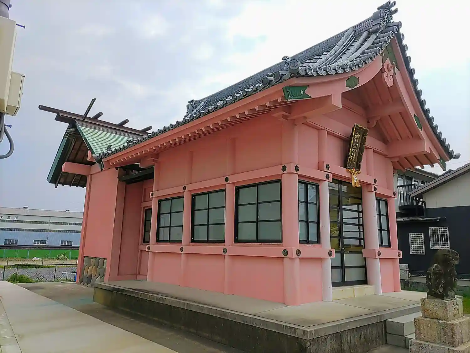 桃色の社殿が目を引きます。