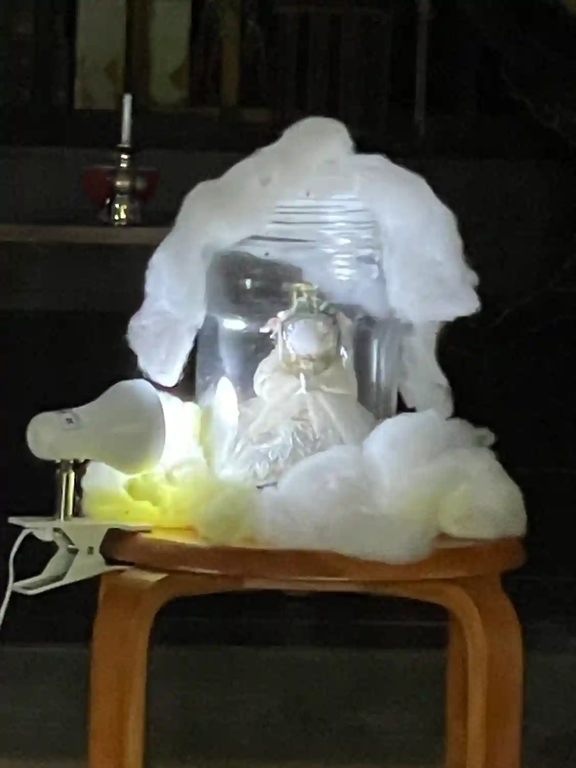 拝殿内は、座椅子やちゃぶ台と言った生活感に加え、瓶に入った人形や鏡を模したらしき物がライトアップされているムー的空気感が混在している。