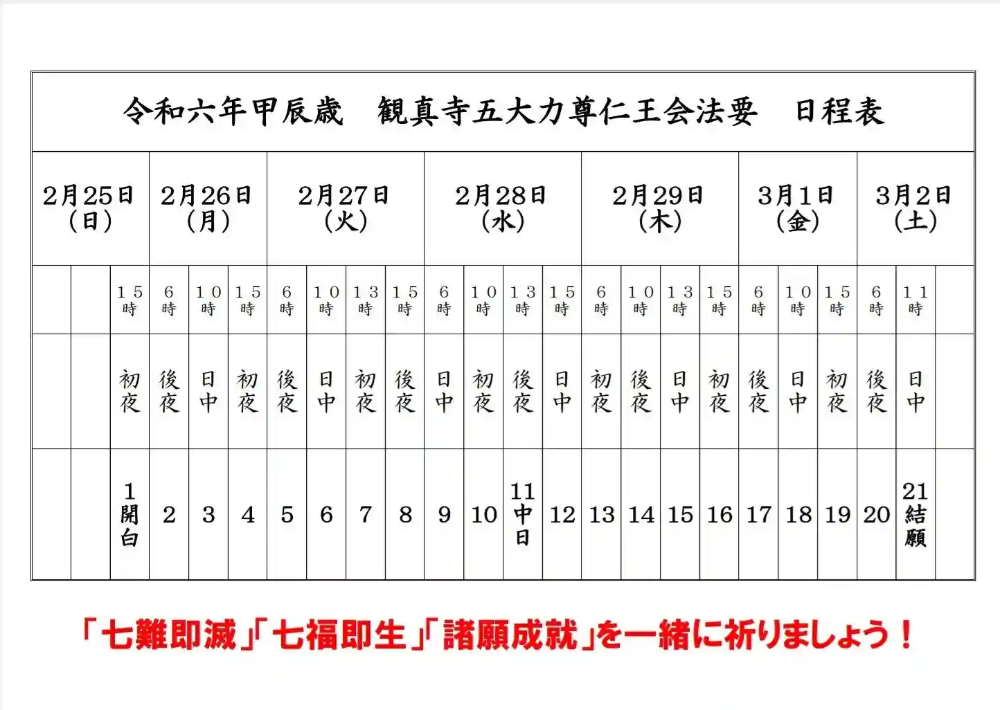 この法要は、真言密教秘奥の大法義であり、毎年2/23本山の醍醐寺に於いても大行事「五大力さん」が行われ、七難即滅(七難がすぐに消滅)・七福即生(七福がすぐに生産される)の祈祷を行う一大権義であります。