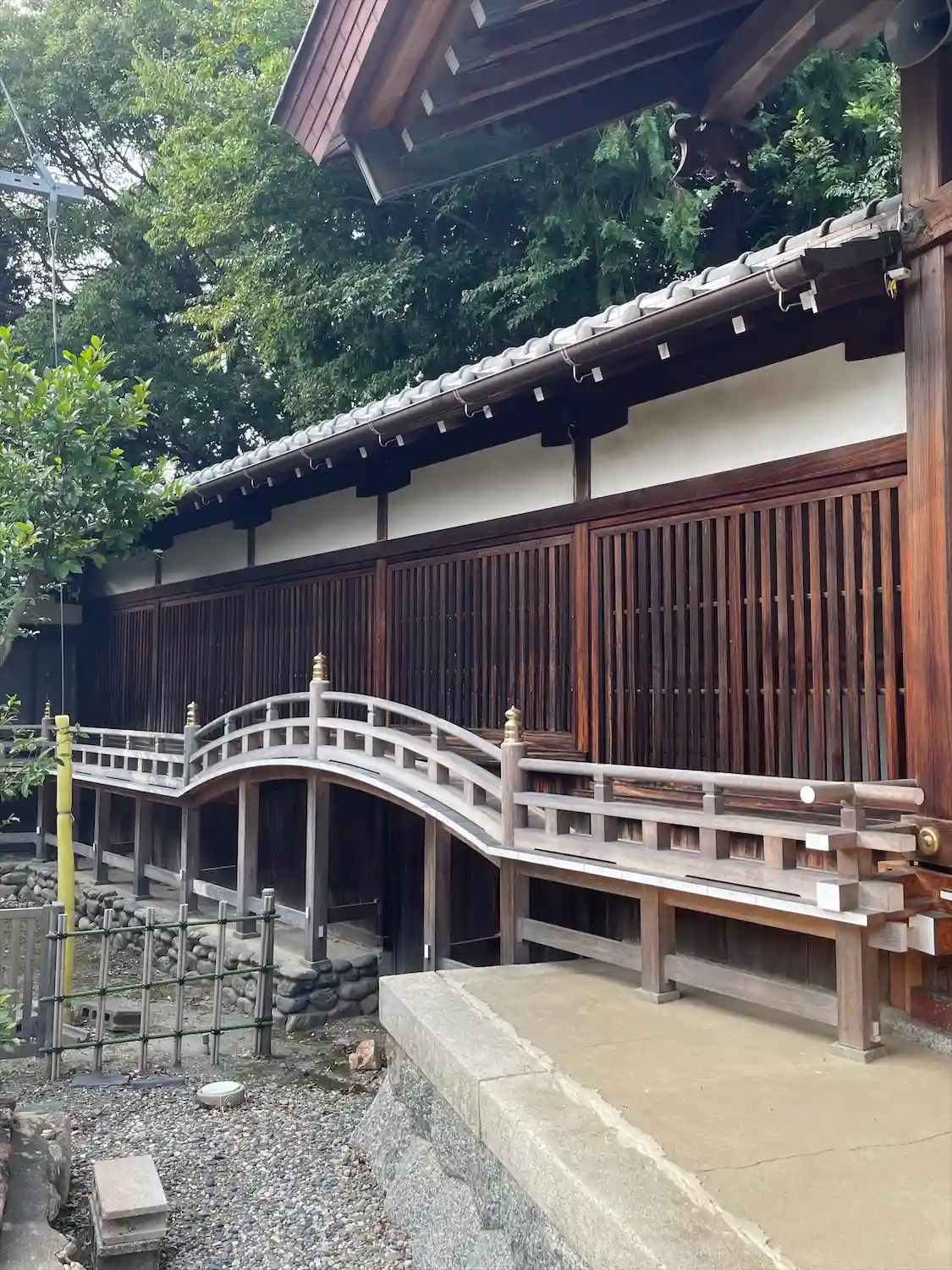 拝殿から繋がる廊下に手摺が付いていて、アーチ状になっているのが気になった。