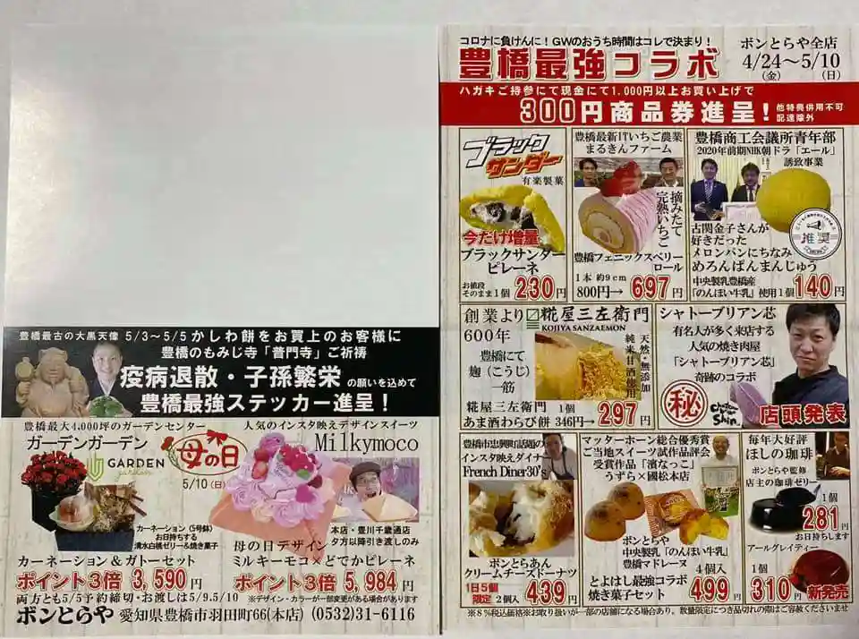 2020年4月24~5月10日、ボンとらやが市内の生産者、企業、飲食店、お寺と協同して、地元豊橋の魅力を発信する「豊橋最強コラボ限定商品」を各店舗で販売します。