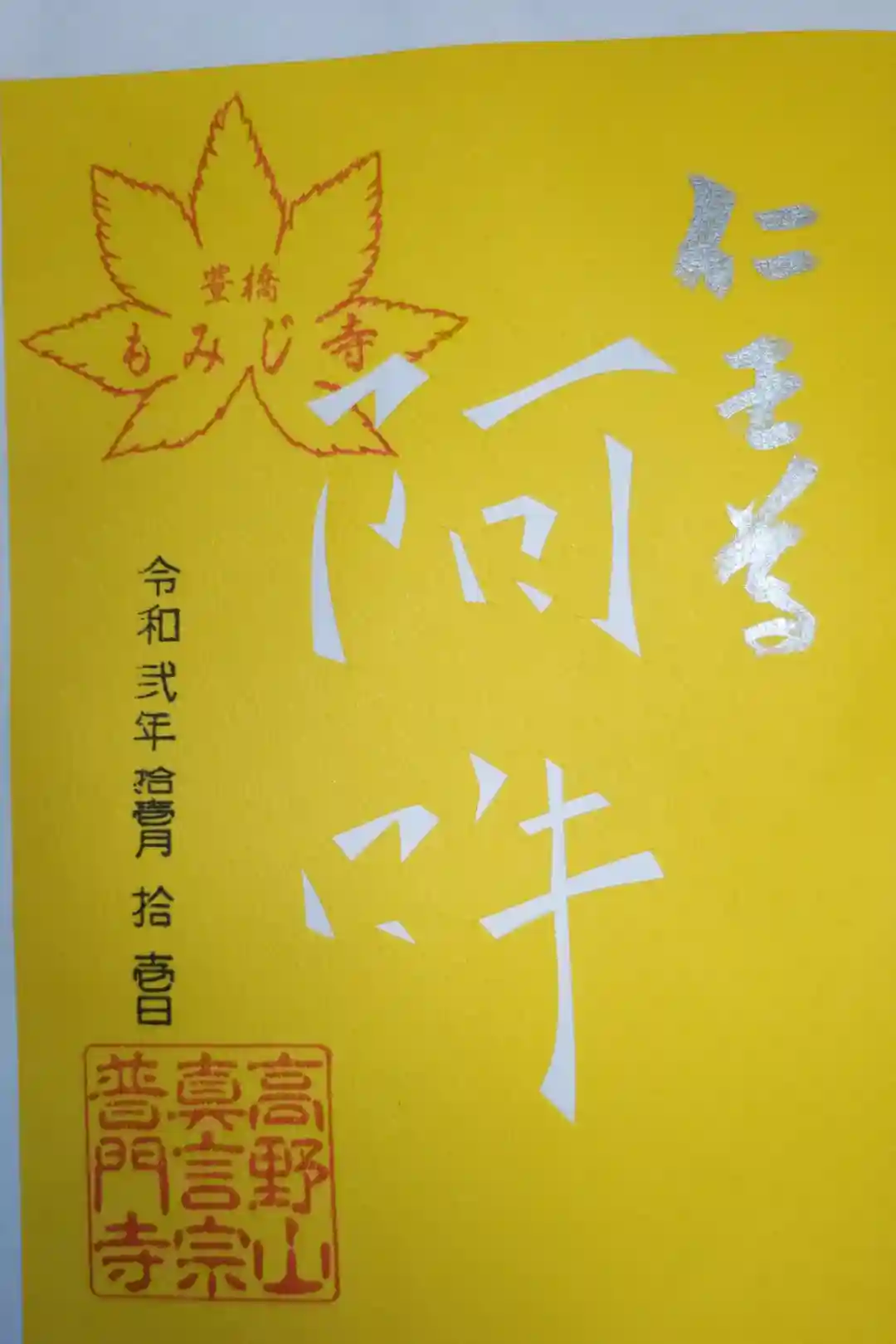 切り絵御朱印。阿吽。銀色の文字で仁王尊。豊橋もみじ寺のスタンプ。