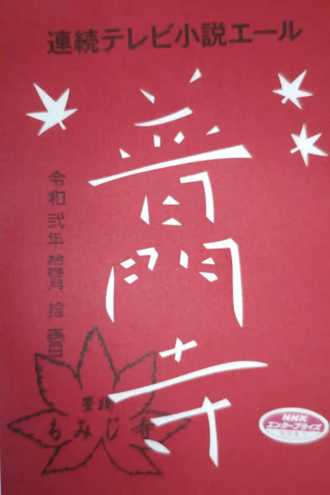 切り絵御朱印、普門寺の文字ともみじ三葉。連続テレビ小説エール、豊橋もみじ寺のスタンプ。NHKエンタープライズ証紙。