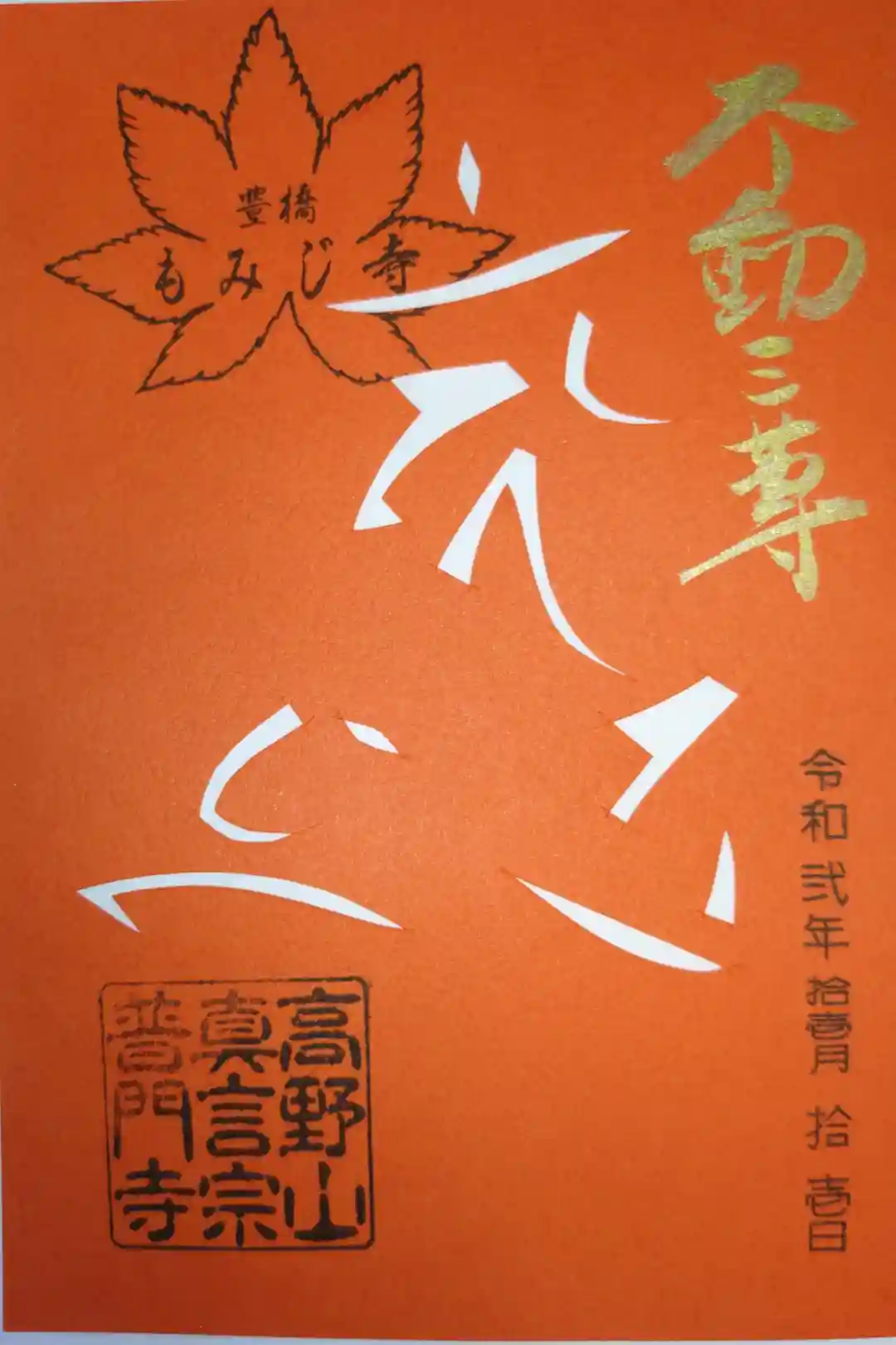 切り絵御朱印。梵字。金文字で不動尊。豊橋もみじ寺スタンプ。オレンジ色紙
