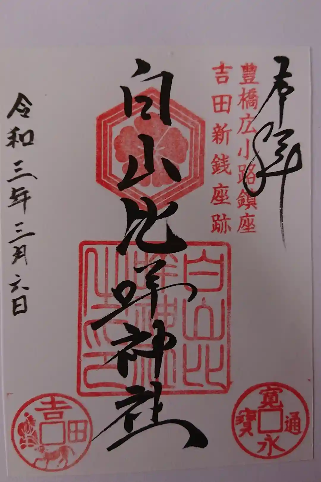 御朱印は本日は宮司さんは最初お参りさせていただいた、安久美神戸神明社に行かれていると社務所に張り紙が有り直書き希望は安久美神戸神明社にと有りましたが小さい子供連れで歩いて戻るのも大変だったので白山比咩神社の賽銭箱の横に書置が有ったので御朱印代は志との事で賽銭箱に納めさせていただきました。