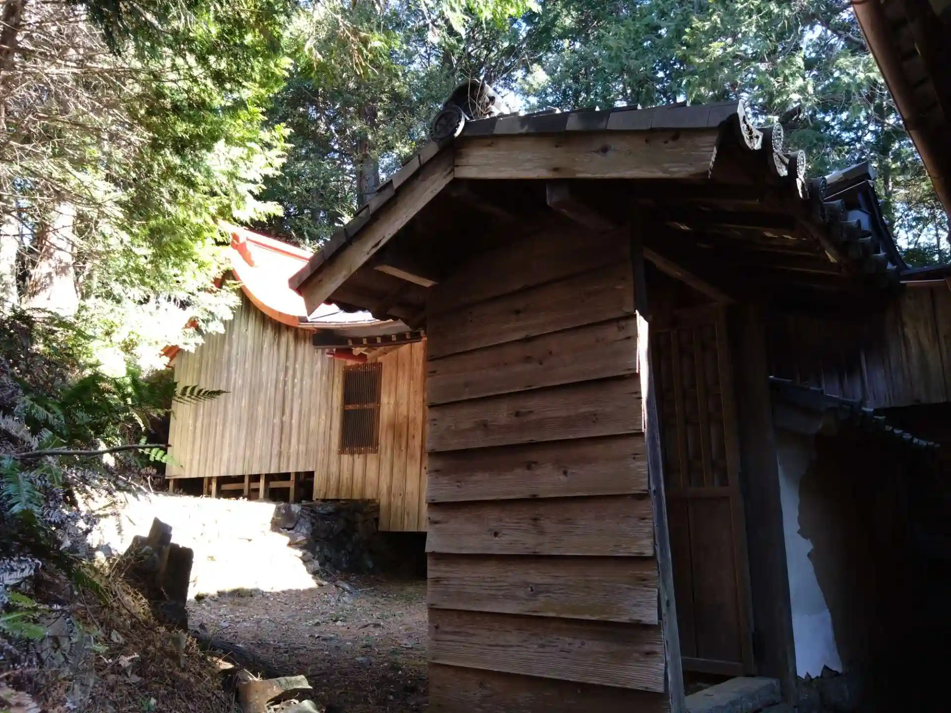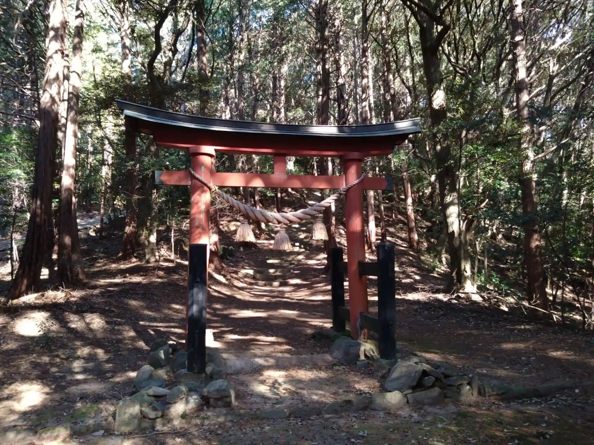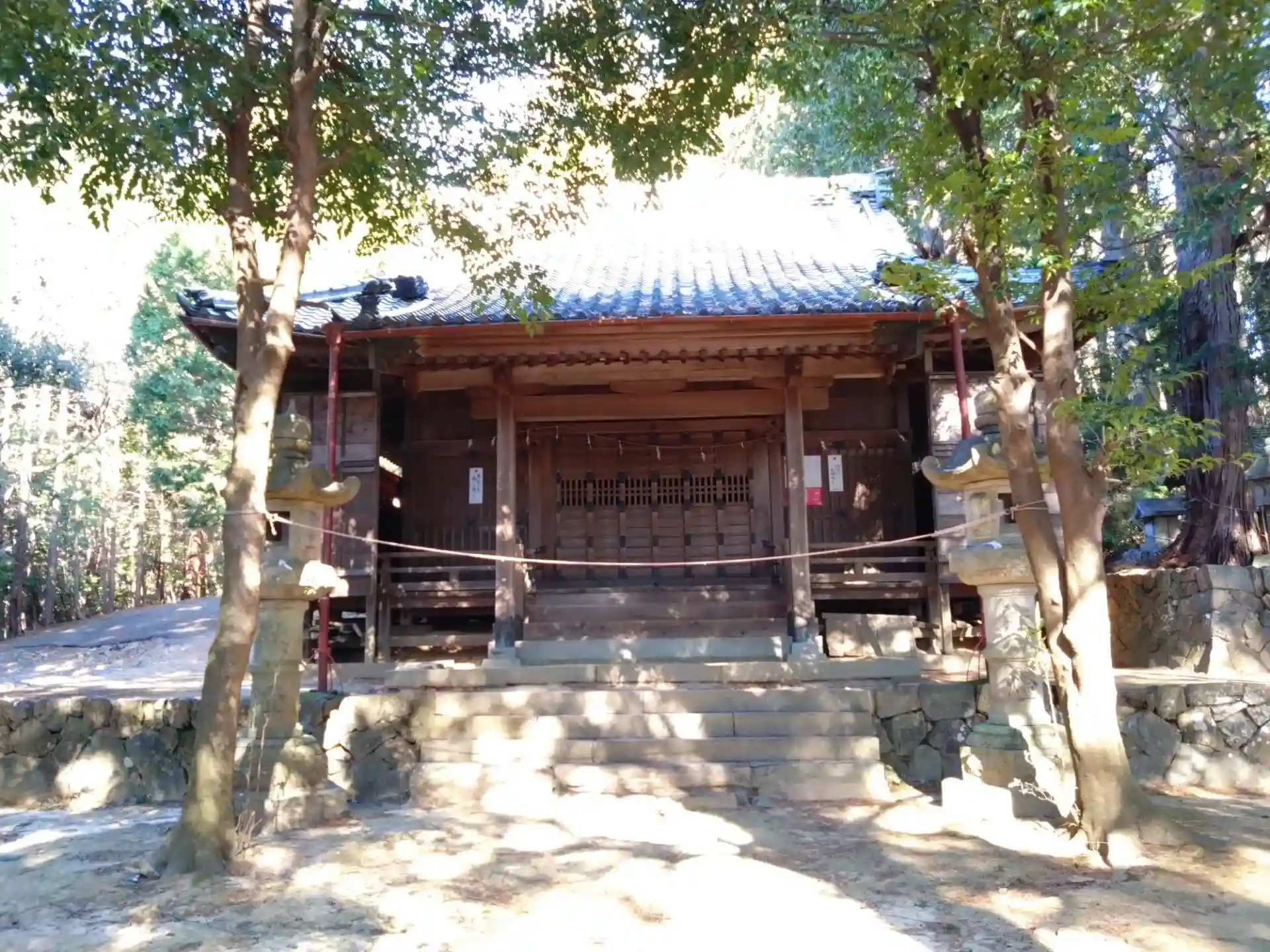獣除けのフェンスを開けて石段を上がった先に社殿があります。そこそこ上がります。でも車でも横道を通れば社殿近くまで行けます。