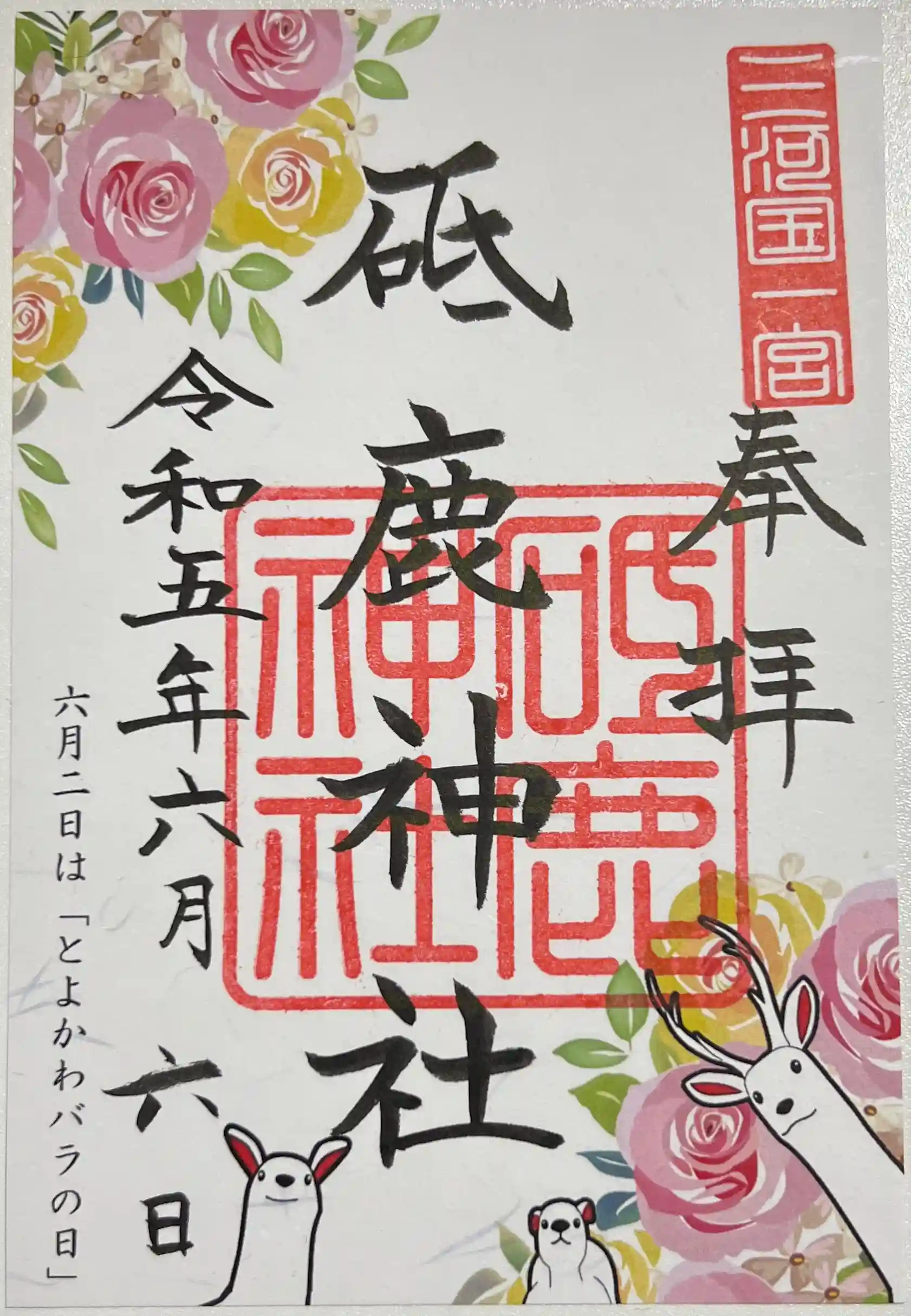 令和5年6月の限定御朱印「とよかわバラ朱印符」です。