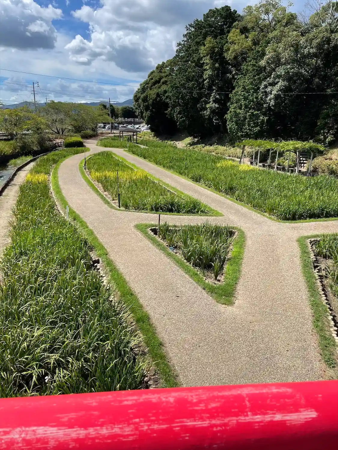 雰囲気抜群の赤いアーチ橋の先に菖蒲園がある。