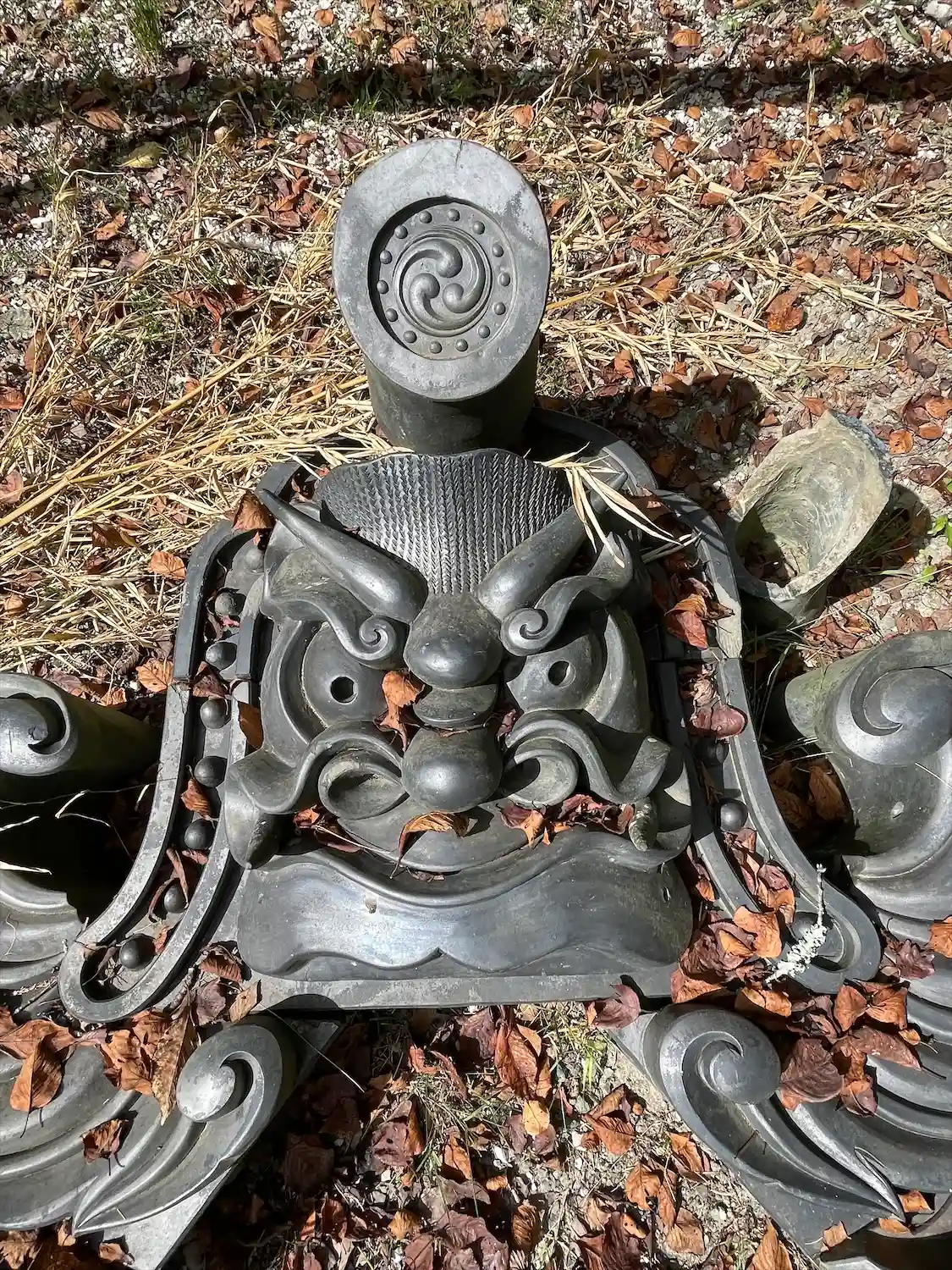 芝生に使用済み鬼瓦が並べて置いてある。