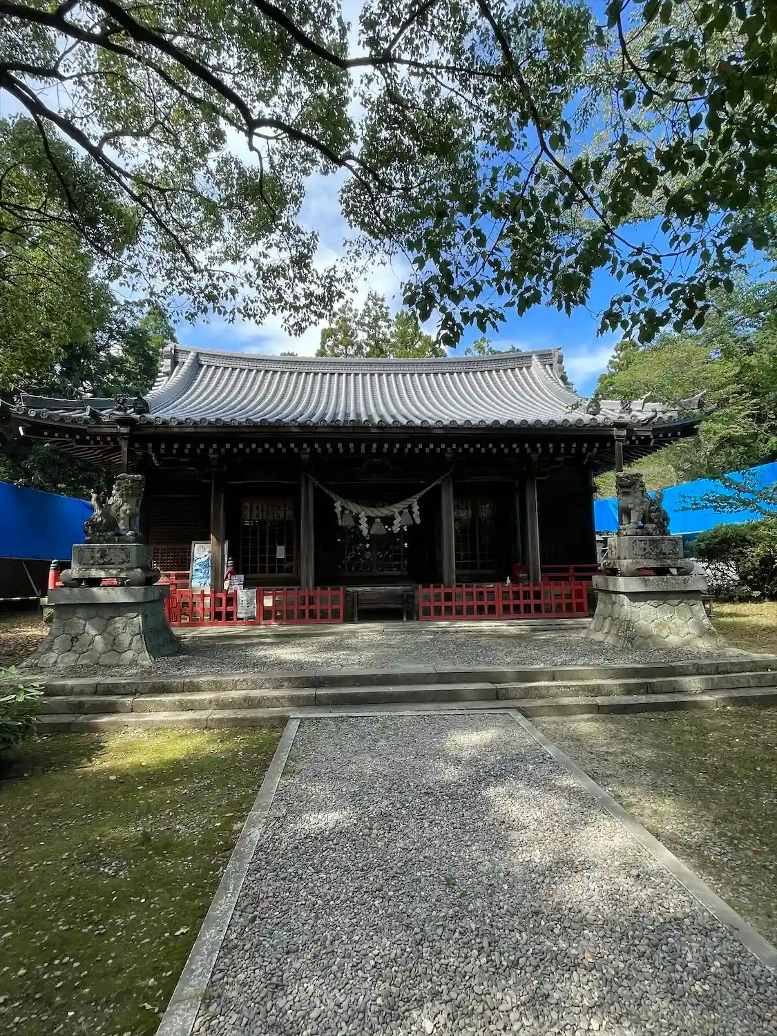 拝殿前の門と手水舎は工事中で、ブルーシートに覆われていた。