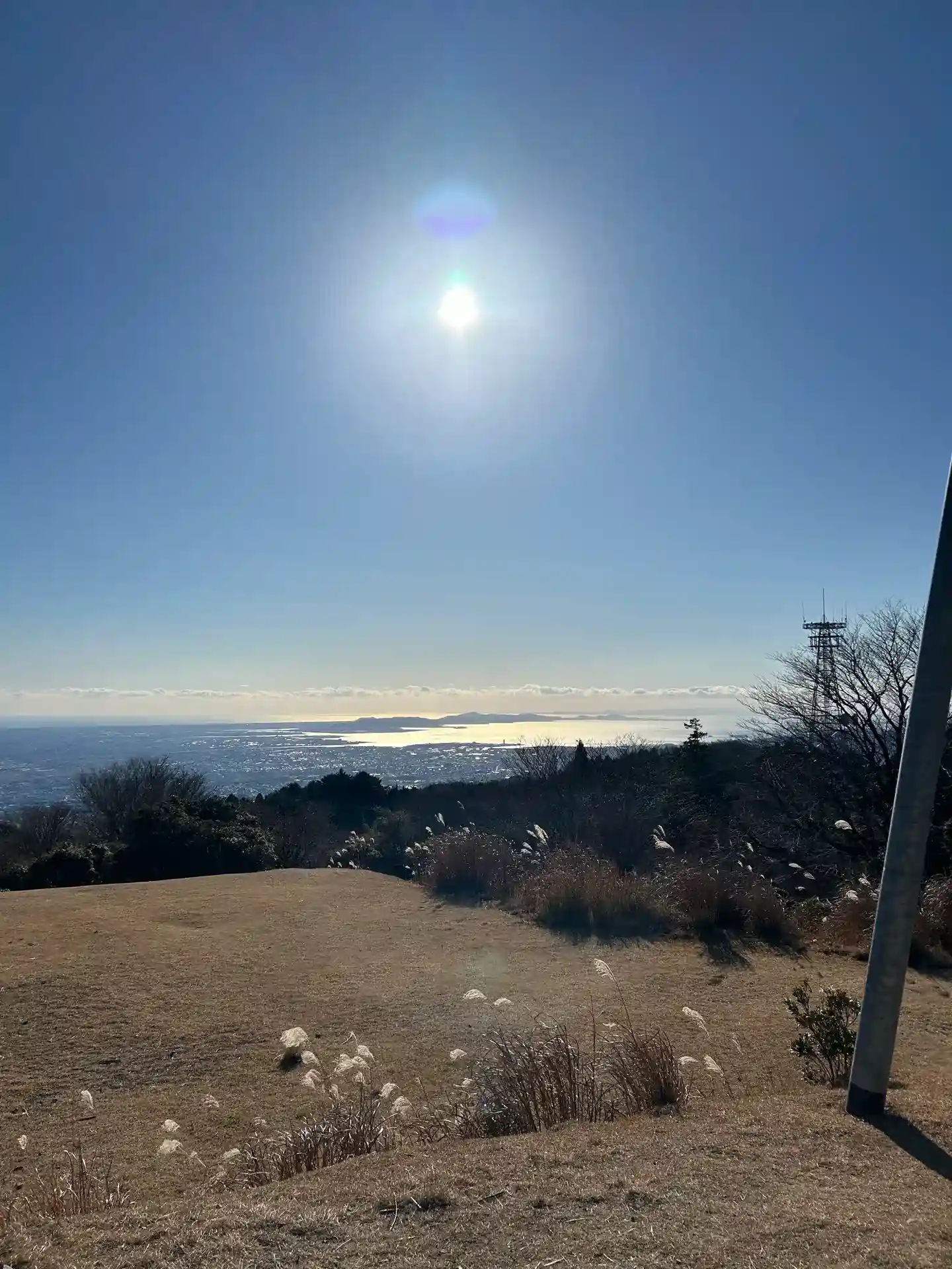 振り返ると絶景!三河湾を一望。海が太陽を反射してギラギラ。後で写真を拡大して見たら、奥に伸びる渥美半島と、さらに海を挟んだ対岸の伊勢志摩まで見えました。