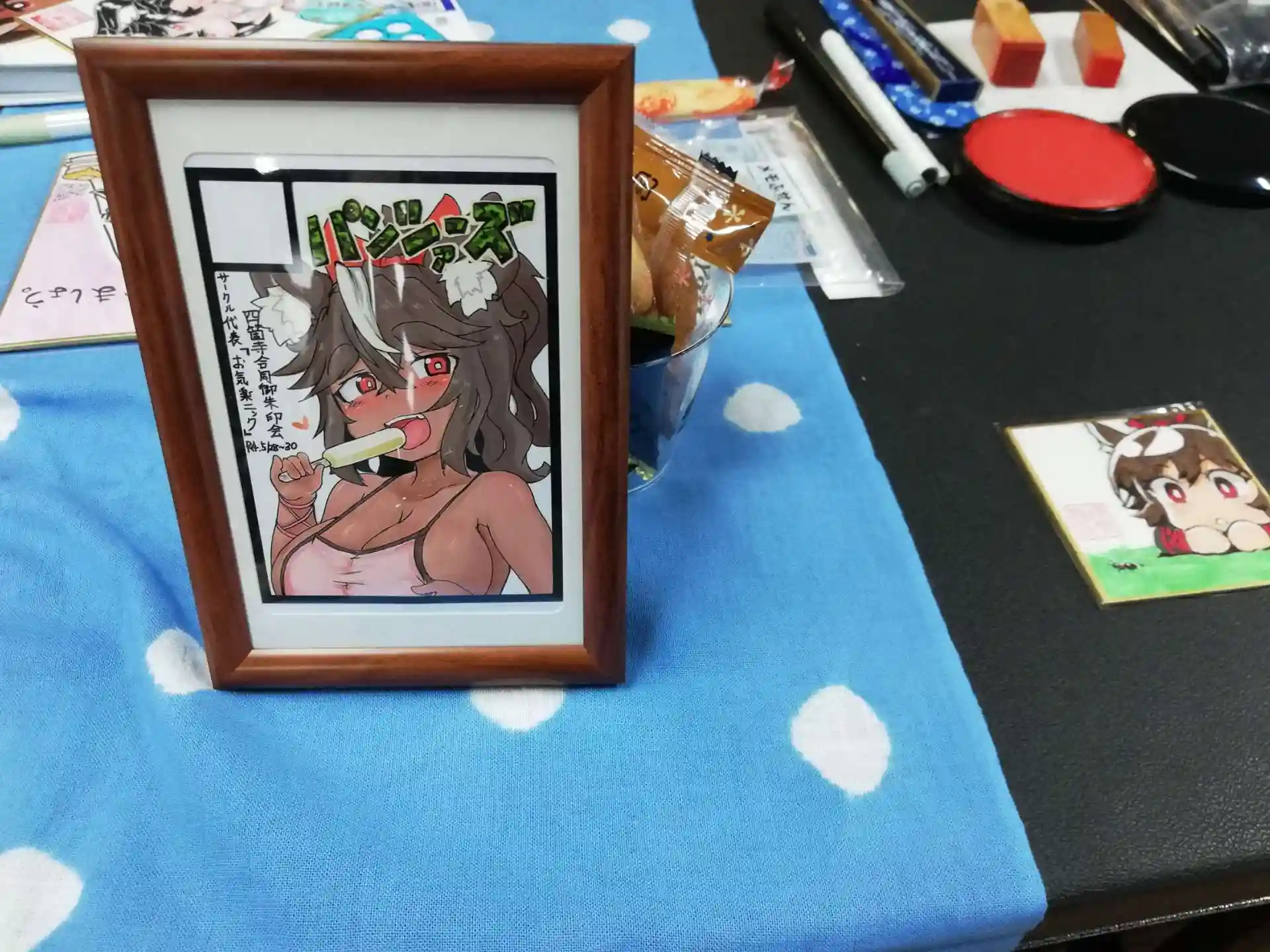 会場はコミケかな?というくらい不思議空間。かわいい絵の授与品だけではなく、画材が本堂の座卓に広げられ、お品書きや注文票、サークルスペースカットにポスター等が飾られ、ご住職様方が歴戦のコミケ戦士であることを物語っていました。豊橋市の専修院様は初参加?なのか、独特の会場運営に沿う準備がなく先輩御朱印戦士達が助けていらっしゃるのが印象的でした。