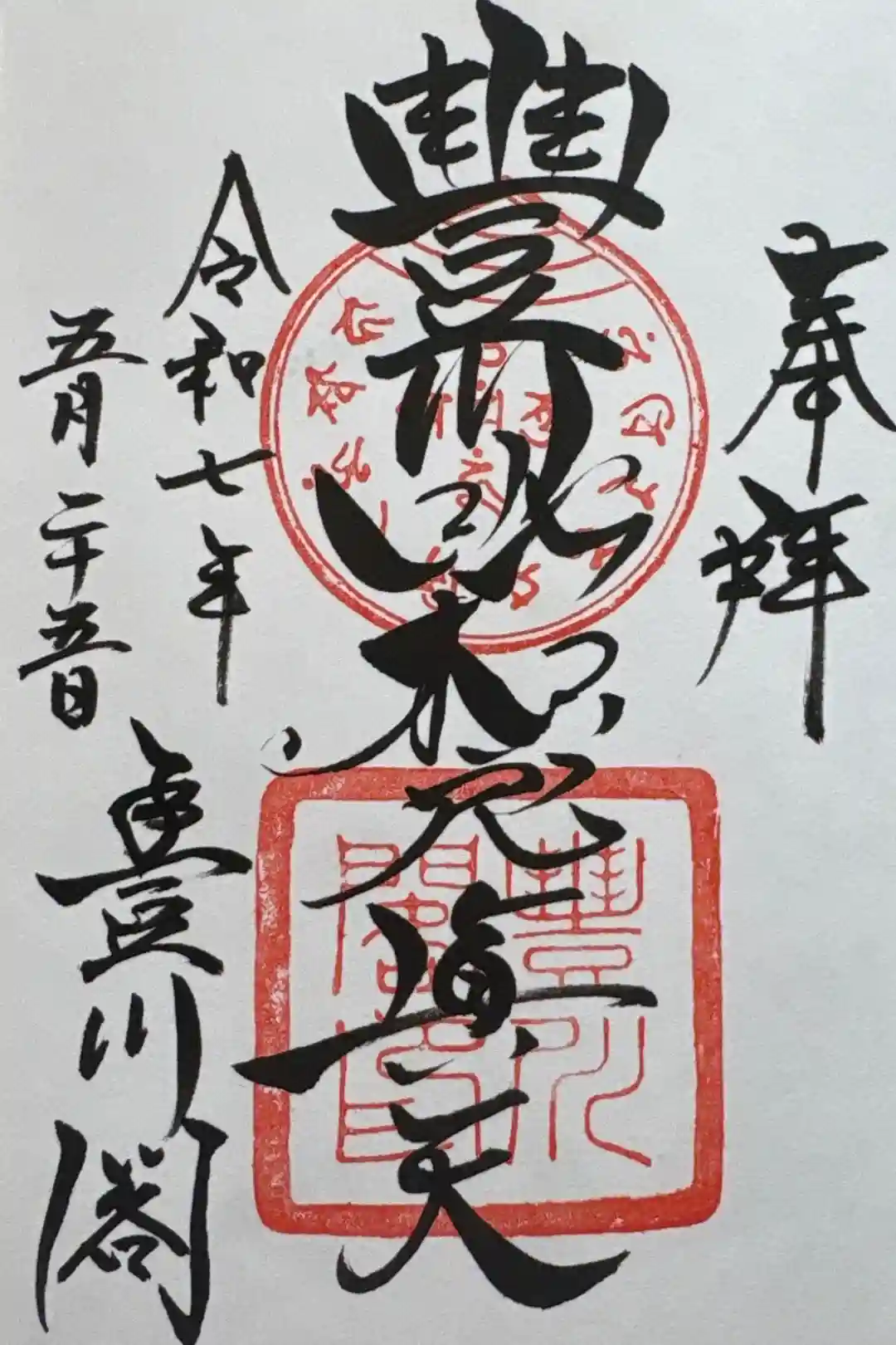 真ん中に豐川吒枳尼眞天、左下に豊川閣と書かれ、真ん中に梵字の印、豊川閣印が押されています。