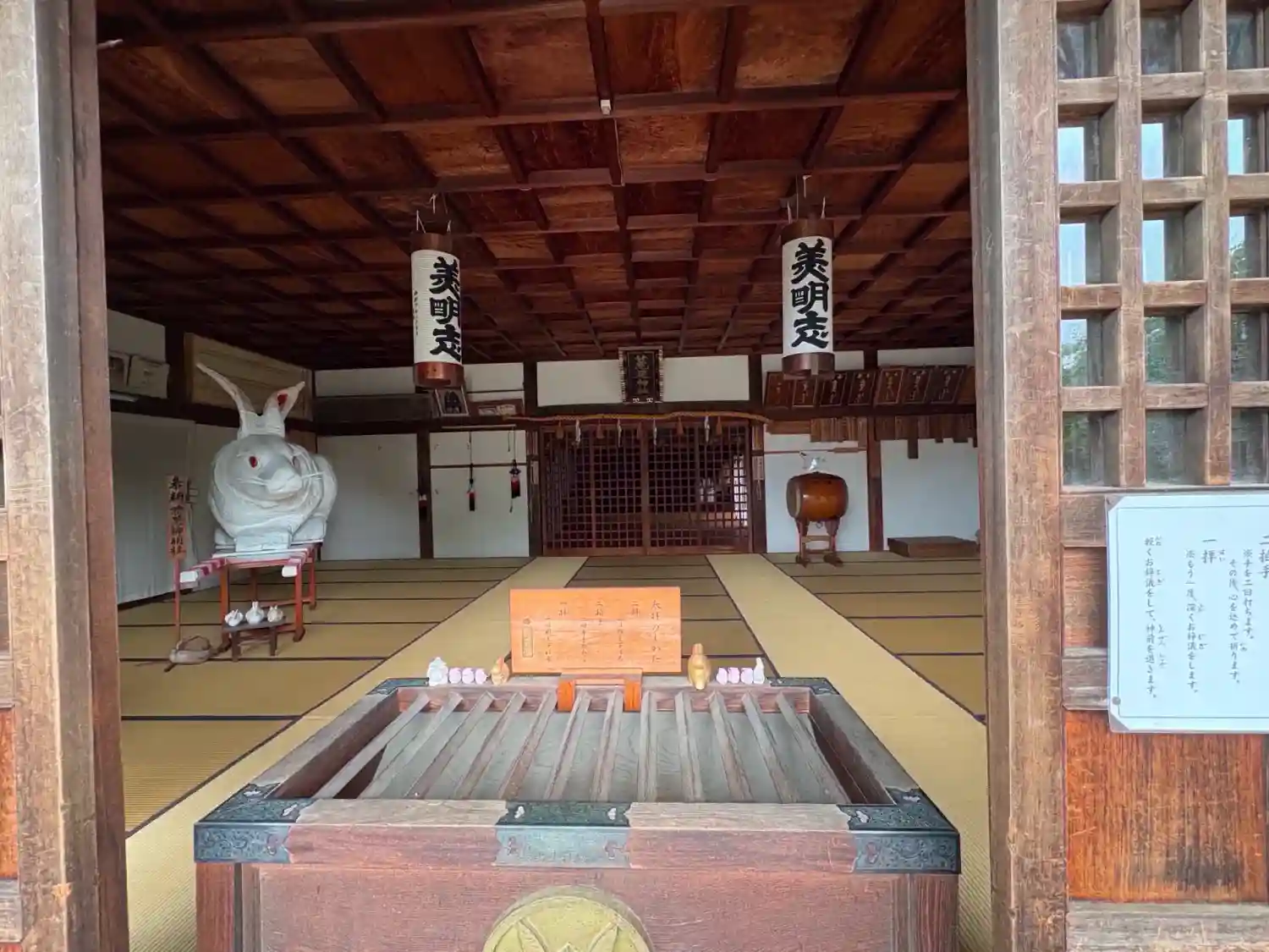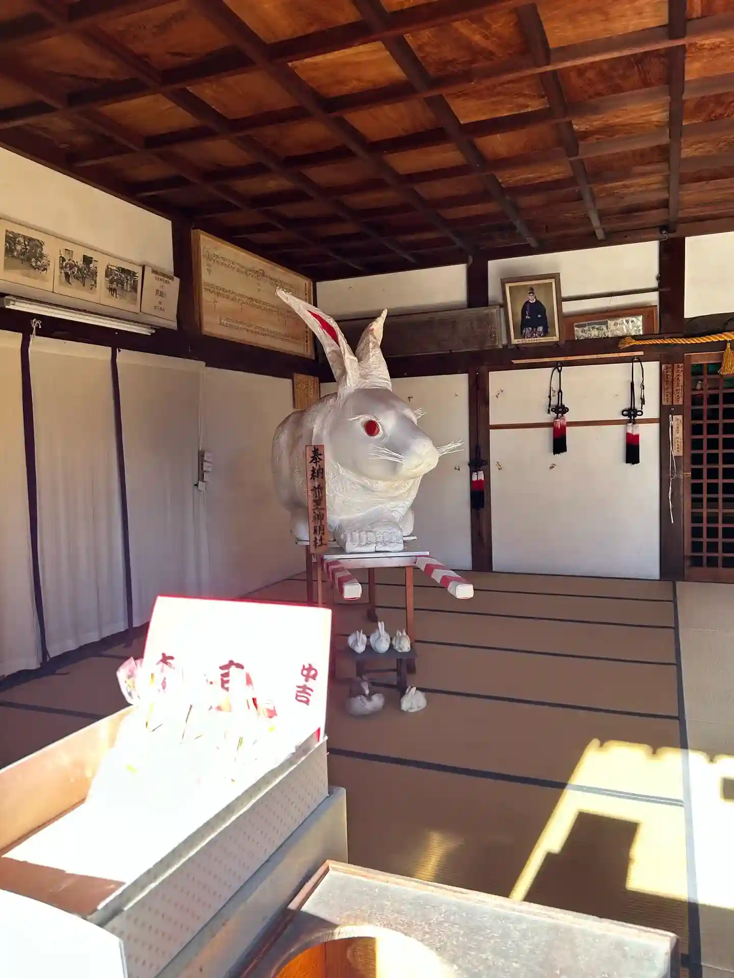 中には御朱印と由緒書きがありました。そして左手に見える大きなウサギ…しかも奉納品のようです。よく見ると長柄がありますし…神輿なのか?