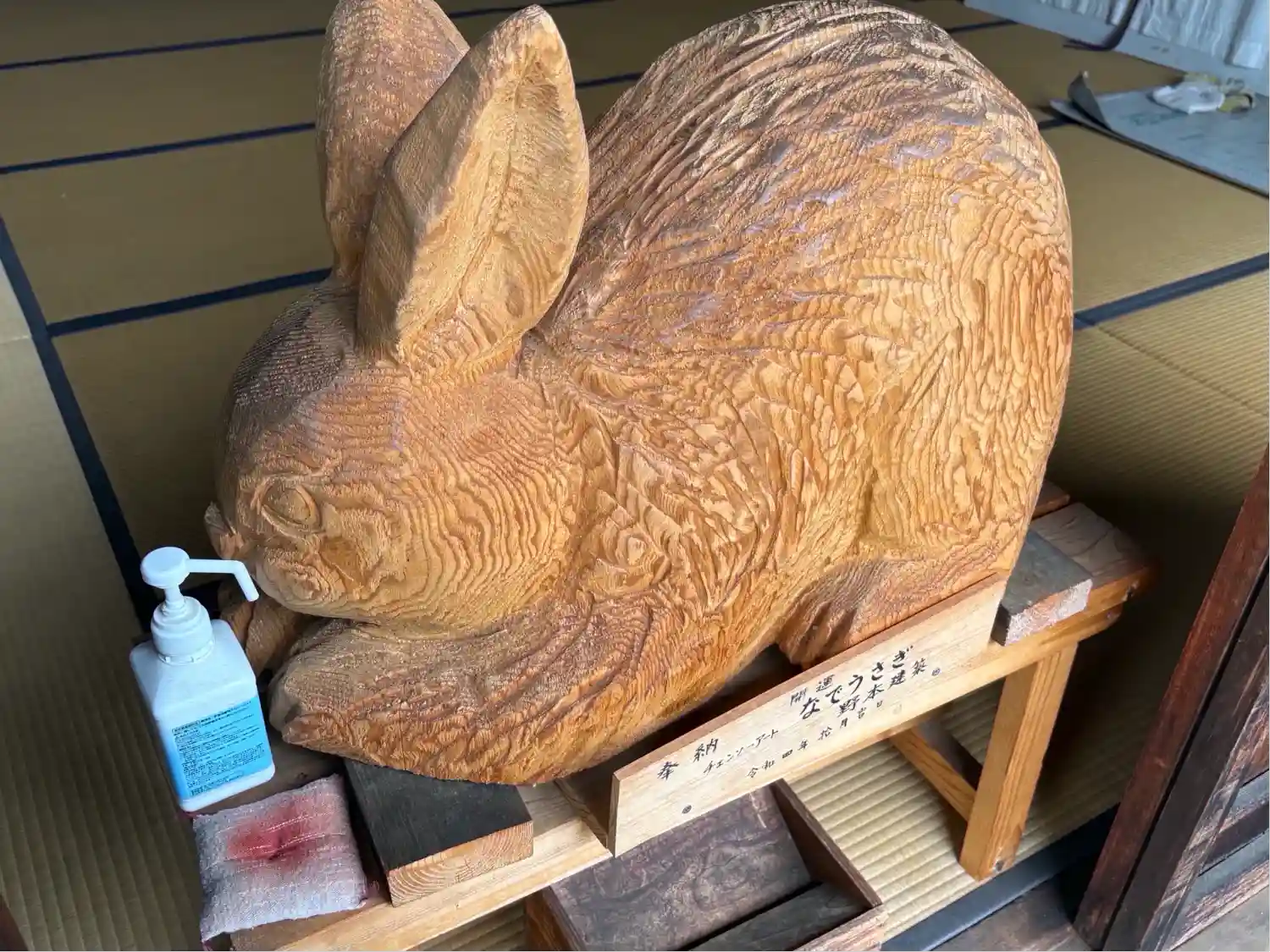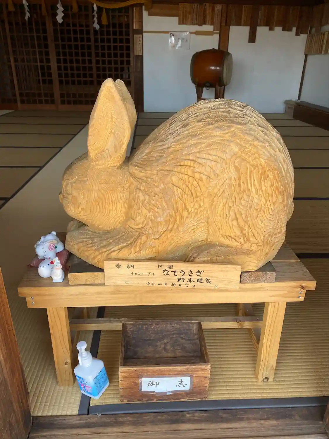拝殿に鎮座する木彫りのなでうさぎ。