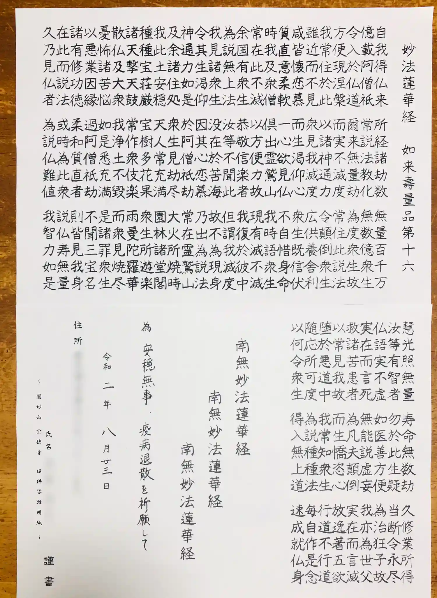 写仏を奉納した宗徳寺さんから御首題が届きました。