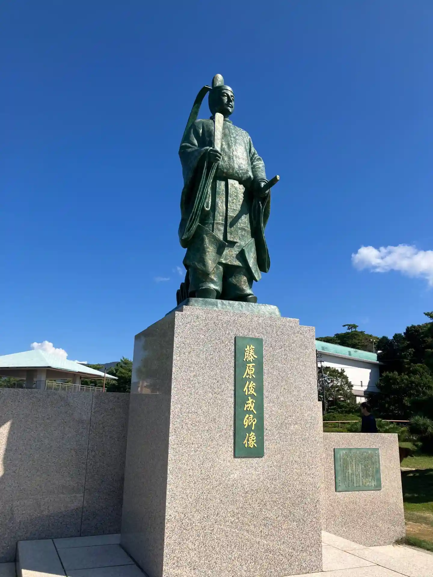 橋を渡る手前の広場で、藤原俊成卿の像がお出迎えしてくれます。