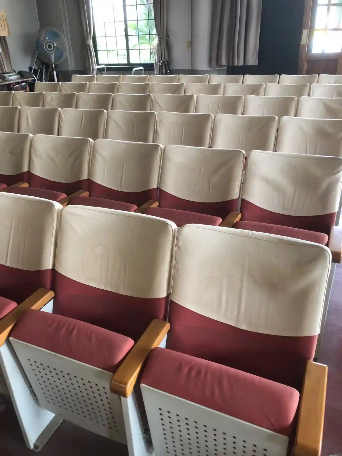 本堂内部が非常に個性的でして。映画館のような座席が並び、昭和レトロな名画座の雰囲気です(写真参照)。法要の参列者には便利かもしれません。