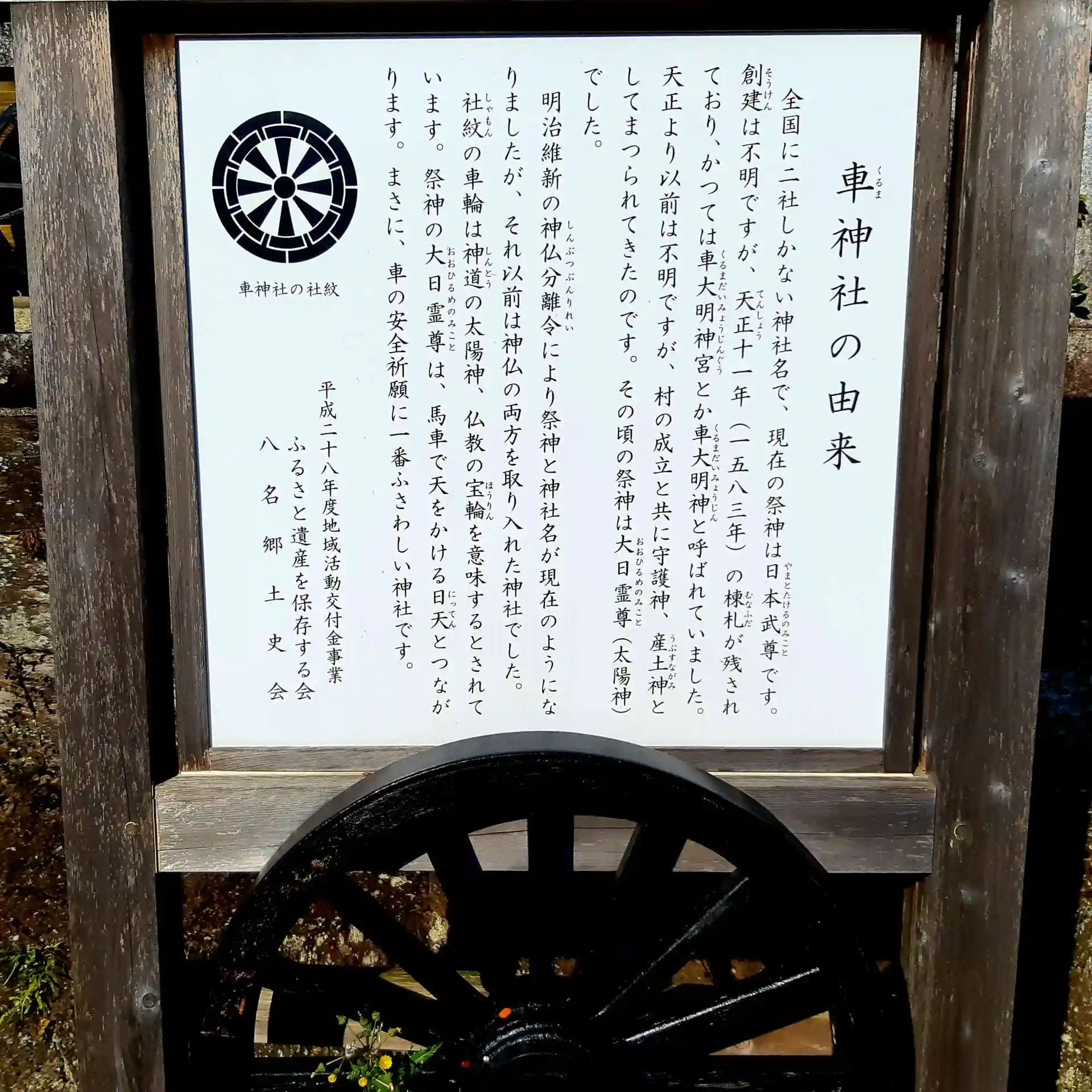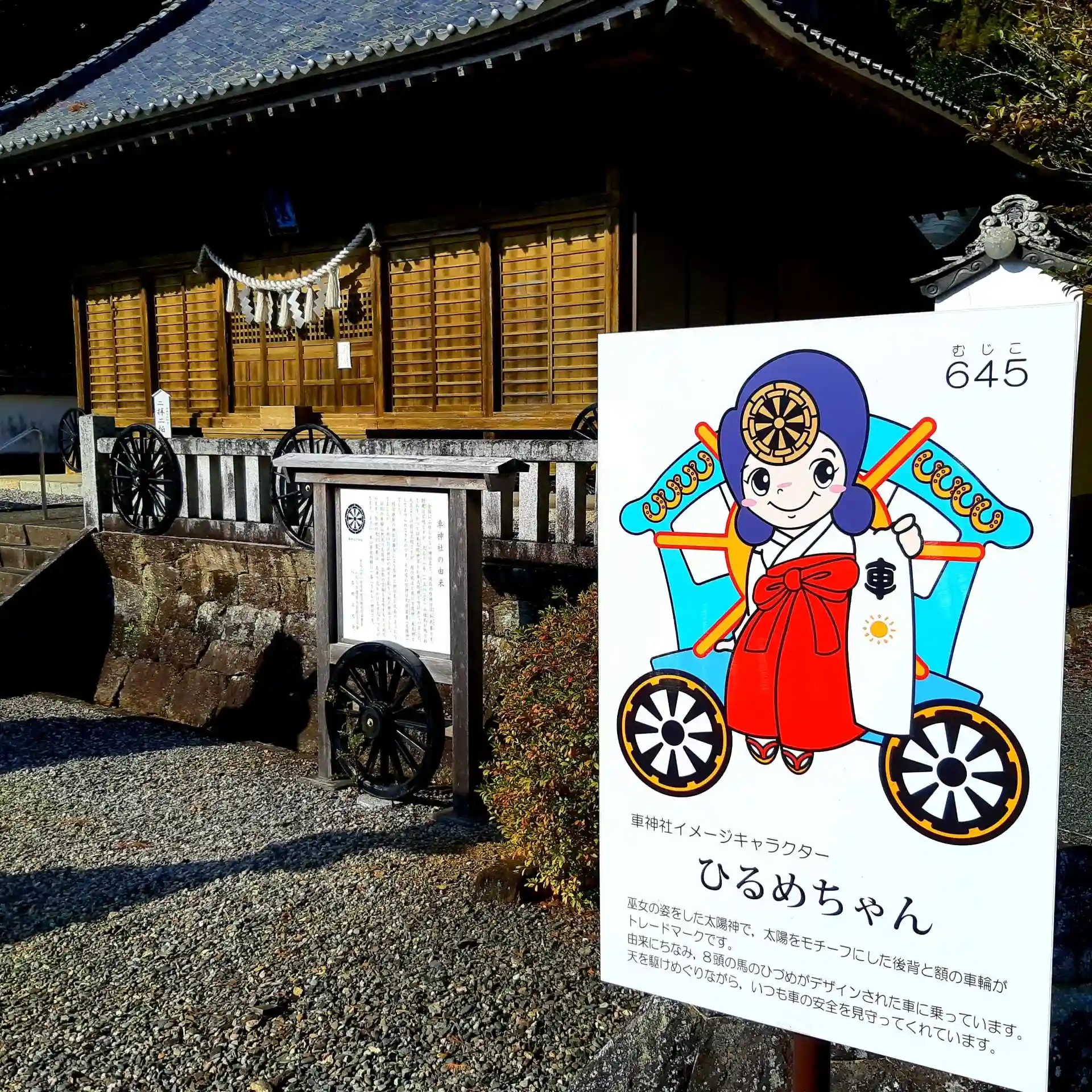 境内の拝殿前には「車輪」が配置され、拝殿を