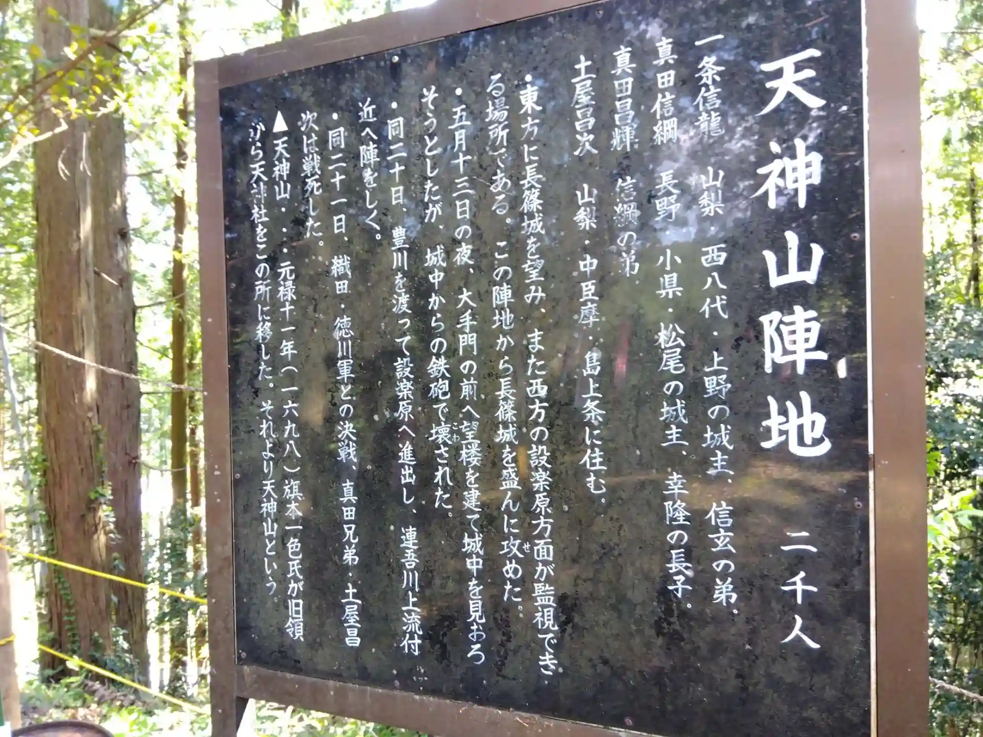 医王寺南西の小山・天神山陣地跡にあり、長篠合戦では真田信綱や真田昌輝、一条信龍らの陣地でした。