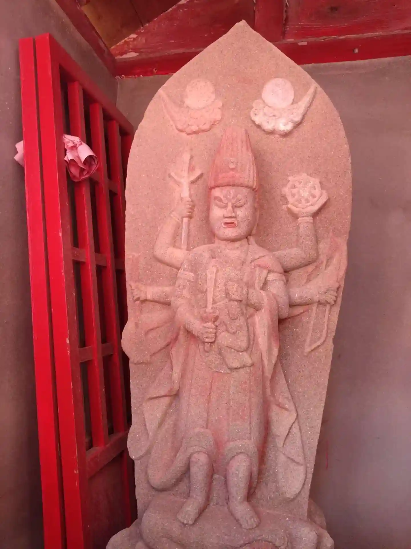 道路沿いに赤い祠がありました。中には赤い石仏がありました。