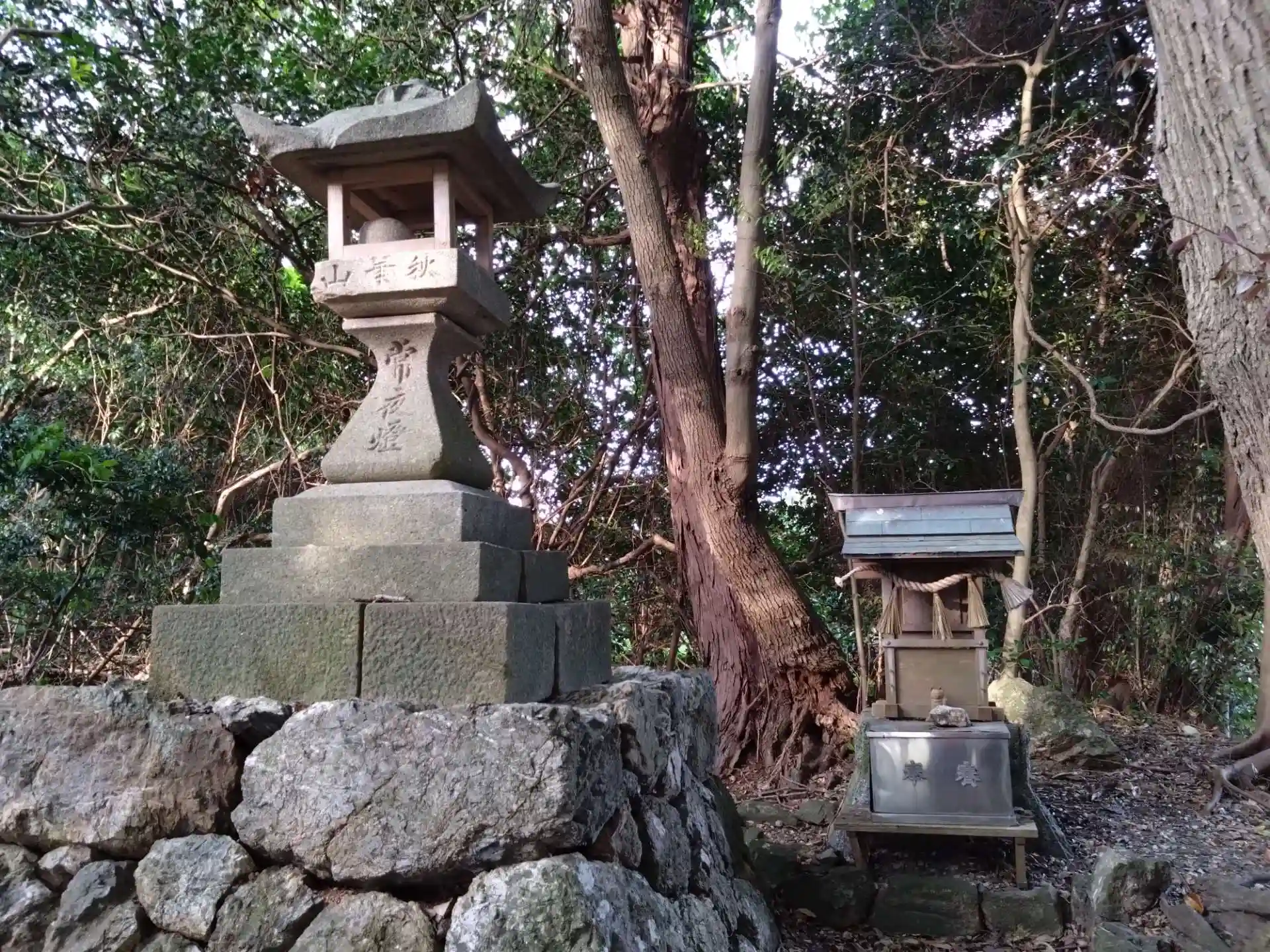 道路沿いの木々の中に小さな社があります。でも立派な鳥居があります。