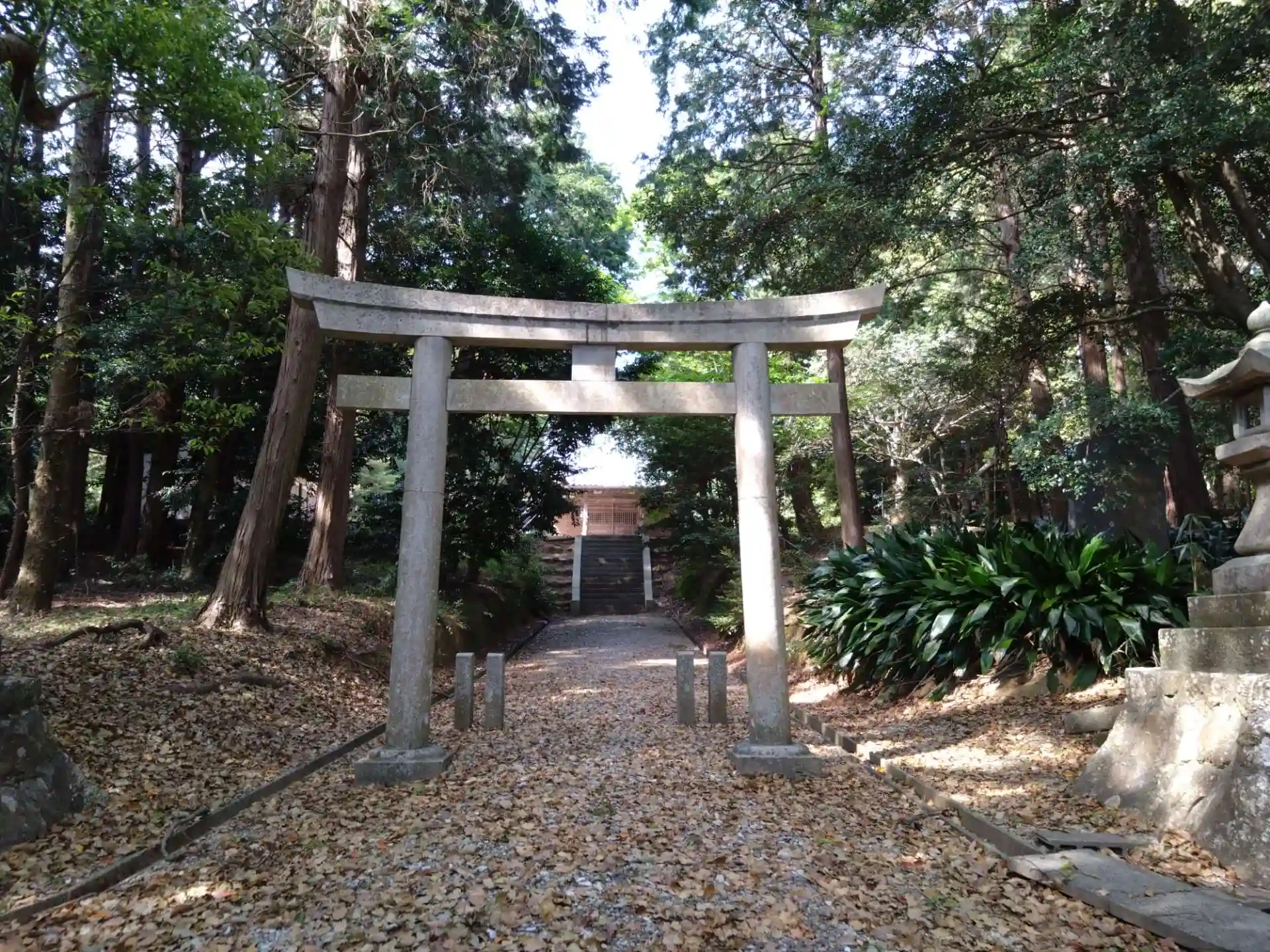 広い道から見えます。鳥居の先には立派な社殿があります。